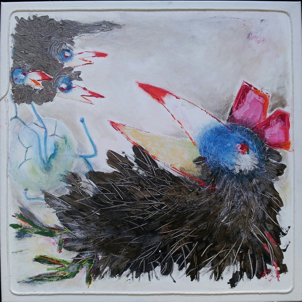 2e Schilderij Kippig. Kip is in de war met zoveel kuikens.