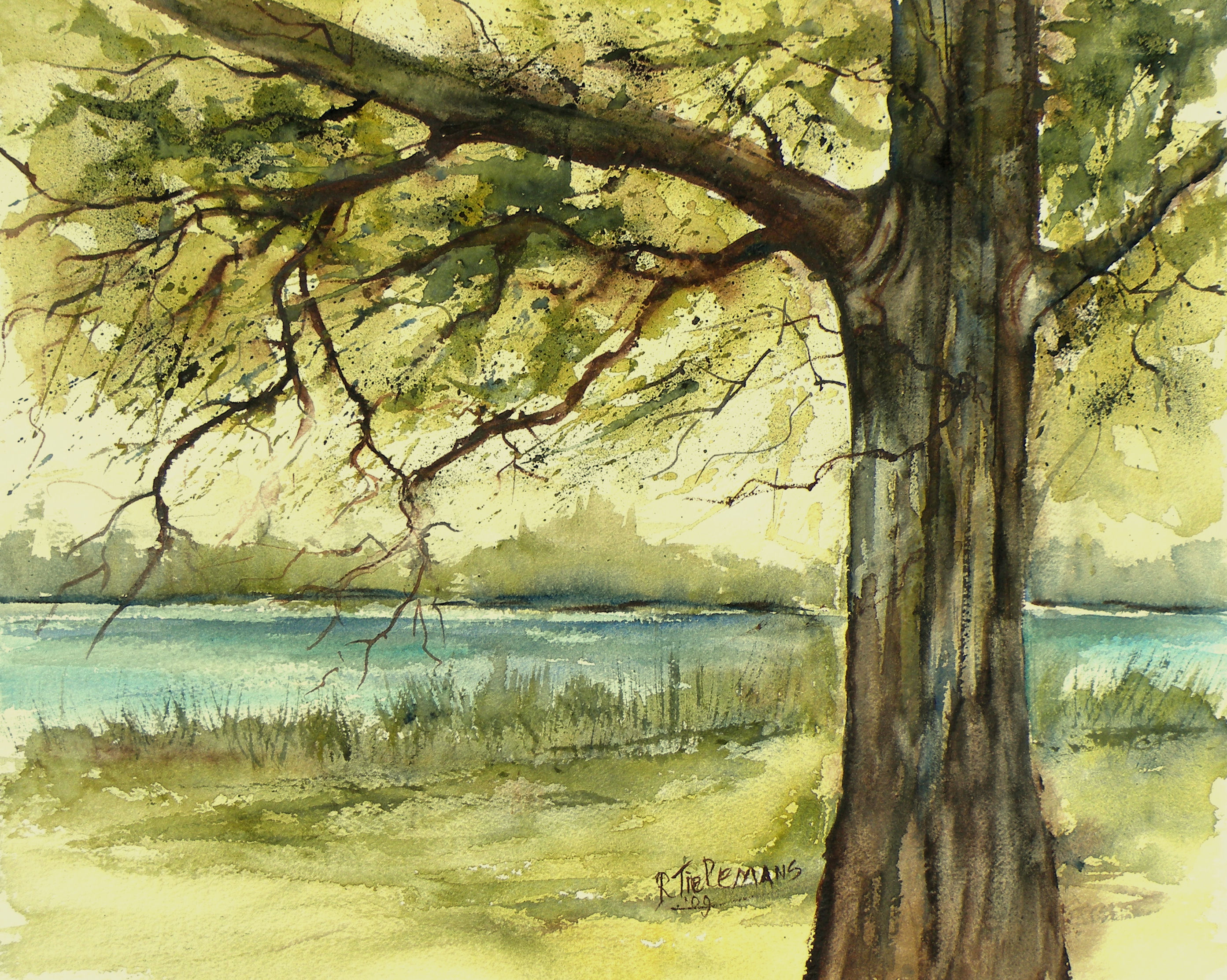 Figuratief Grijs Zwart Landschap Blauw Groen Bruin Blue Water Aquarel Realistisch Natuur Green Boom Black Brown Bank Landscape Figurative Tree Rivier Nature River Oever Realistic