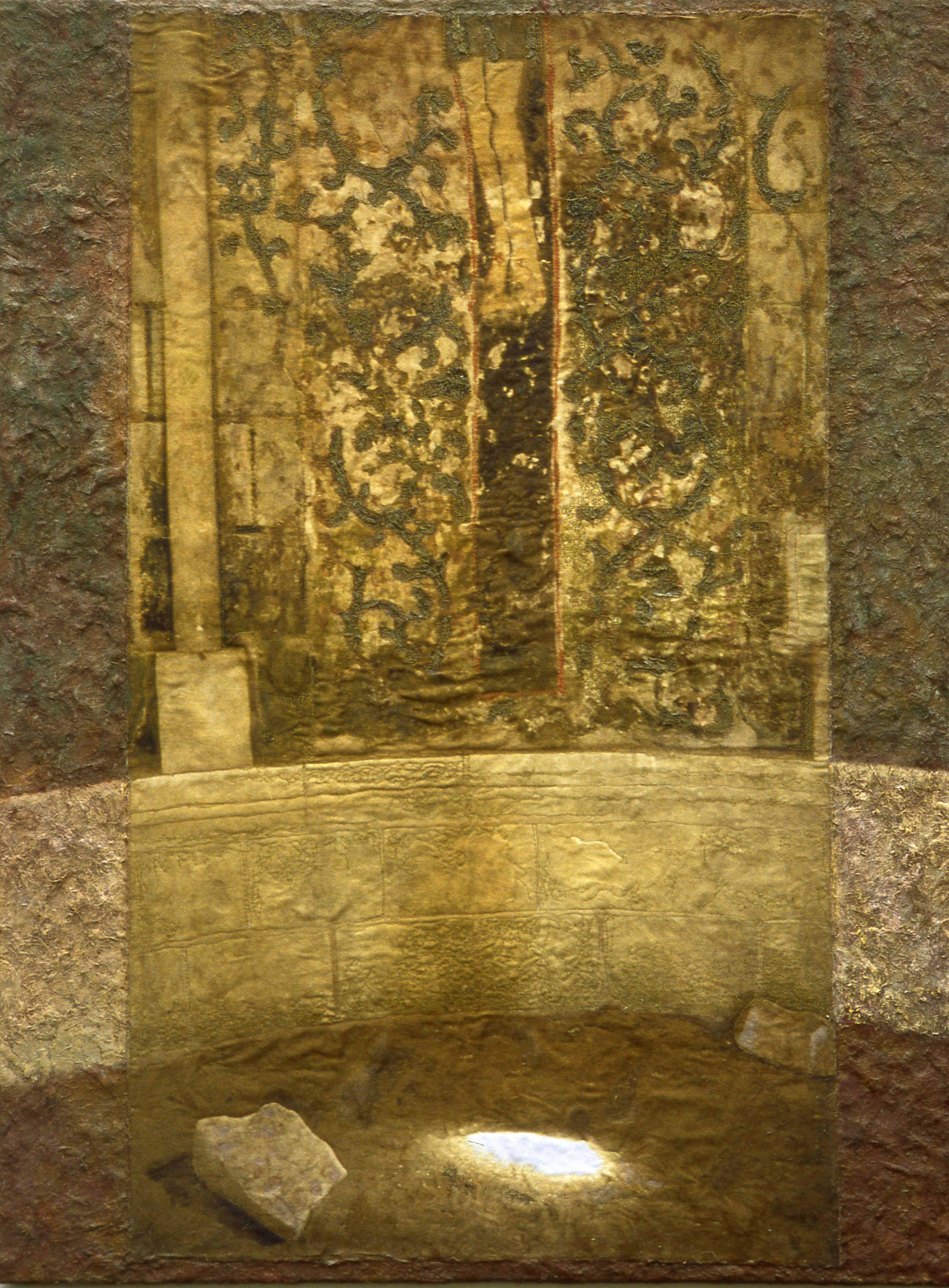 Ik ben een materialen mens, en maak samenvoegingen van verschillende materialen; foto’s, stoffen en borduursels, soms ook gecombineerd met hout, lood en steen, op wisselende formaten