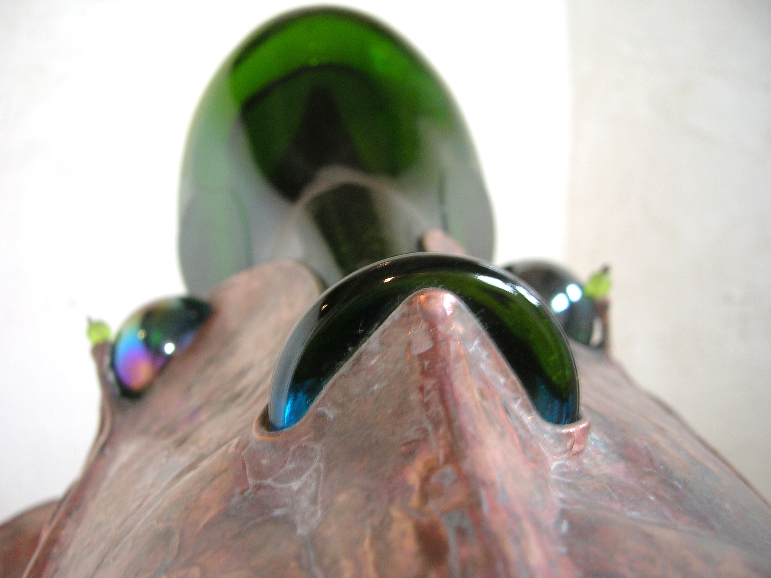 Sculptuur met verlichting binnenin. Het kunstwerk is gemaakt uit glas en lood dat vertind is en vervolgens gepatineerd.