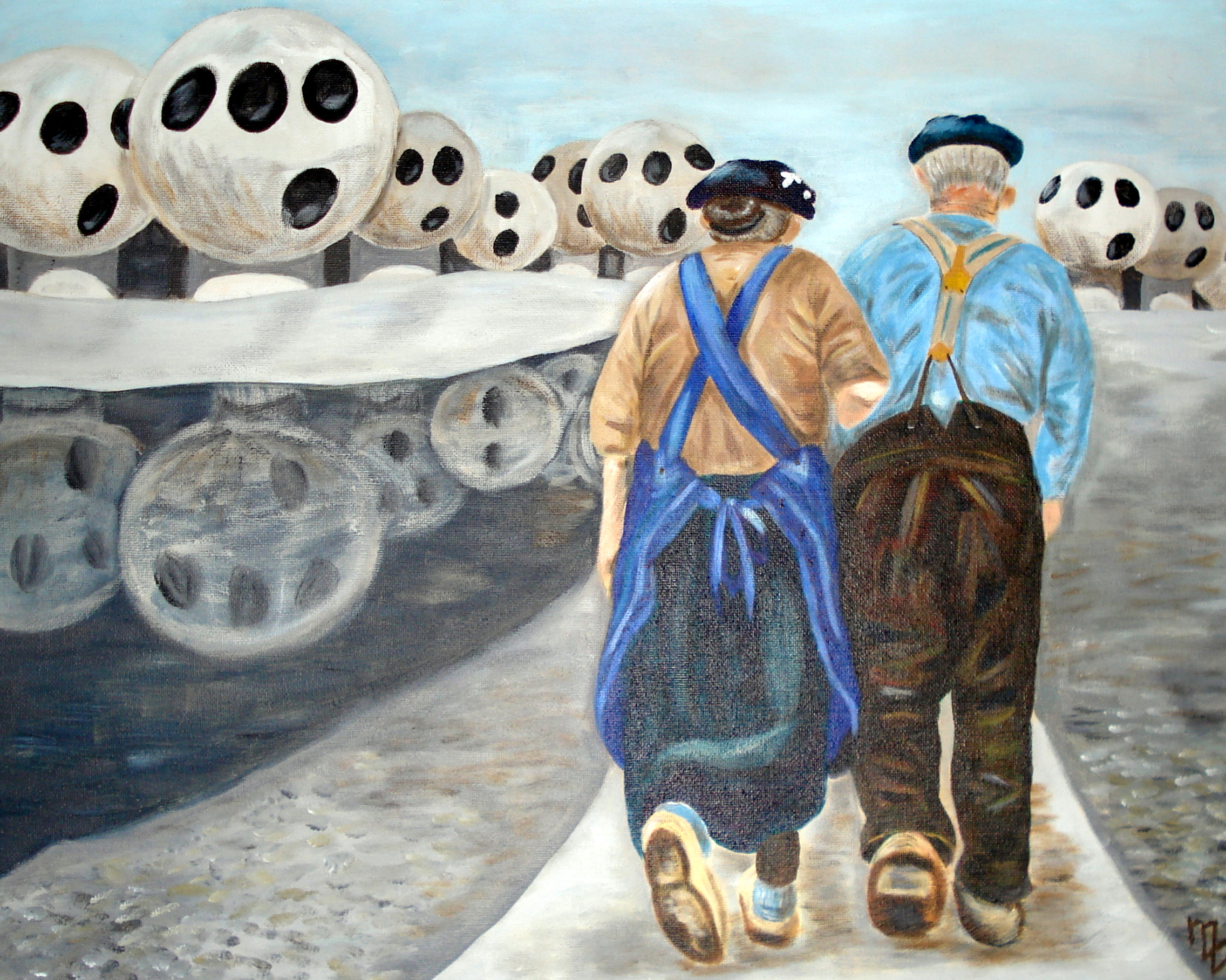Oude kleurrijke mensen in een nieuwe grijze vervreemdende wereld.