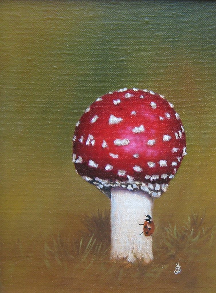 Op een grote paddestoel, rood met witte stippen.... soms geen kabouter spillebeen maar een lieveheersbeestje.