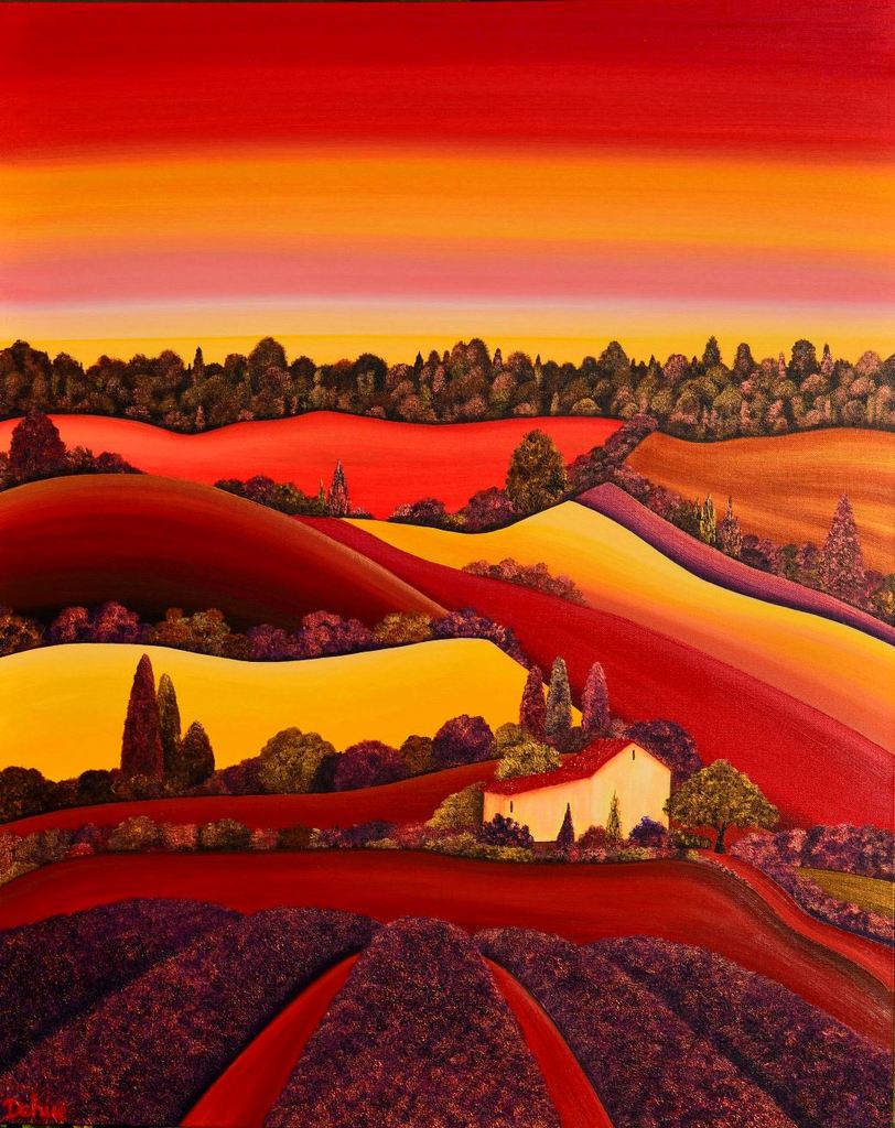 Kleurrijk warm en sfeervol Frans landschap met heuvels, velden, boerderij en lavendel. Gemengd met veel goud- en koperverf waardoor het schilderij een warme gloed krijgt