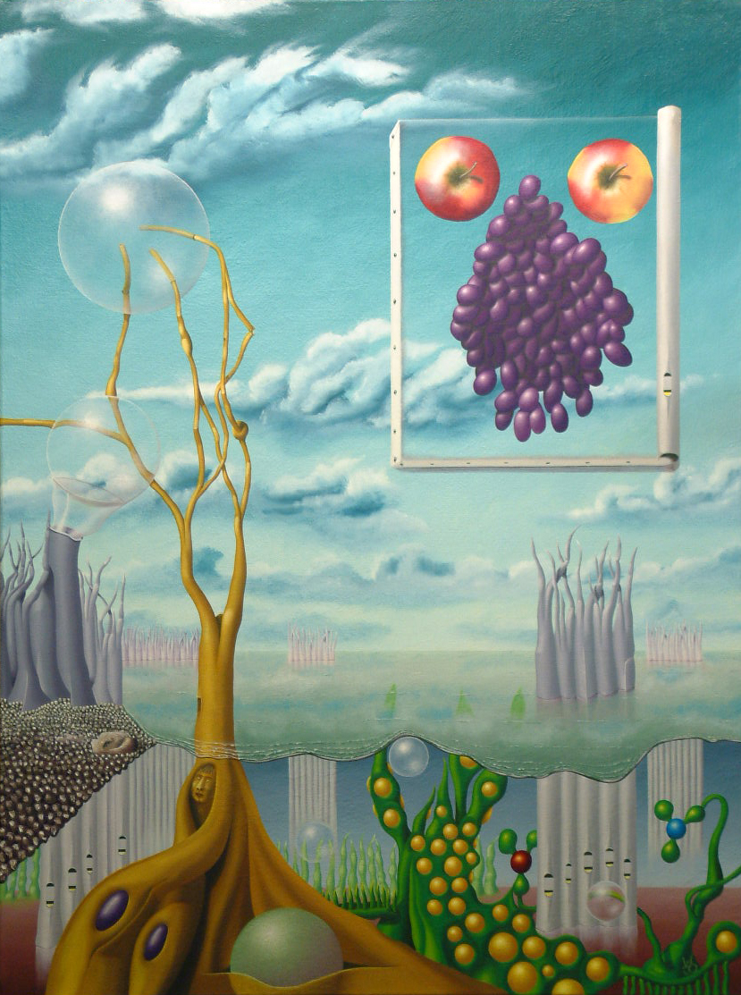 Surrealistische olieverfschilderijen van kunstenaar Jo Willems. Het heldere kleurgebruik is een van de kenmerken van zijn schilderijen.