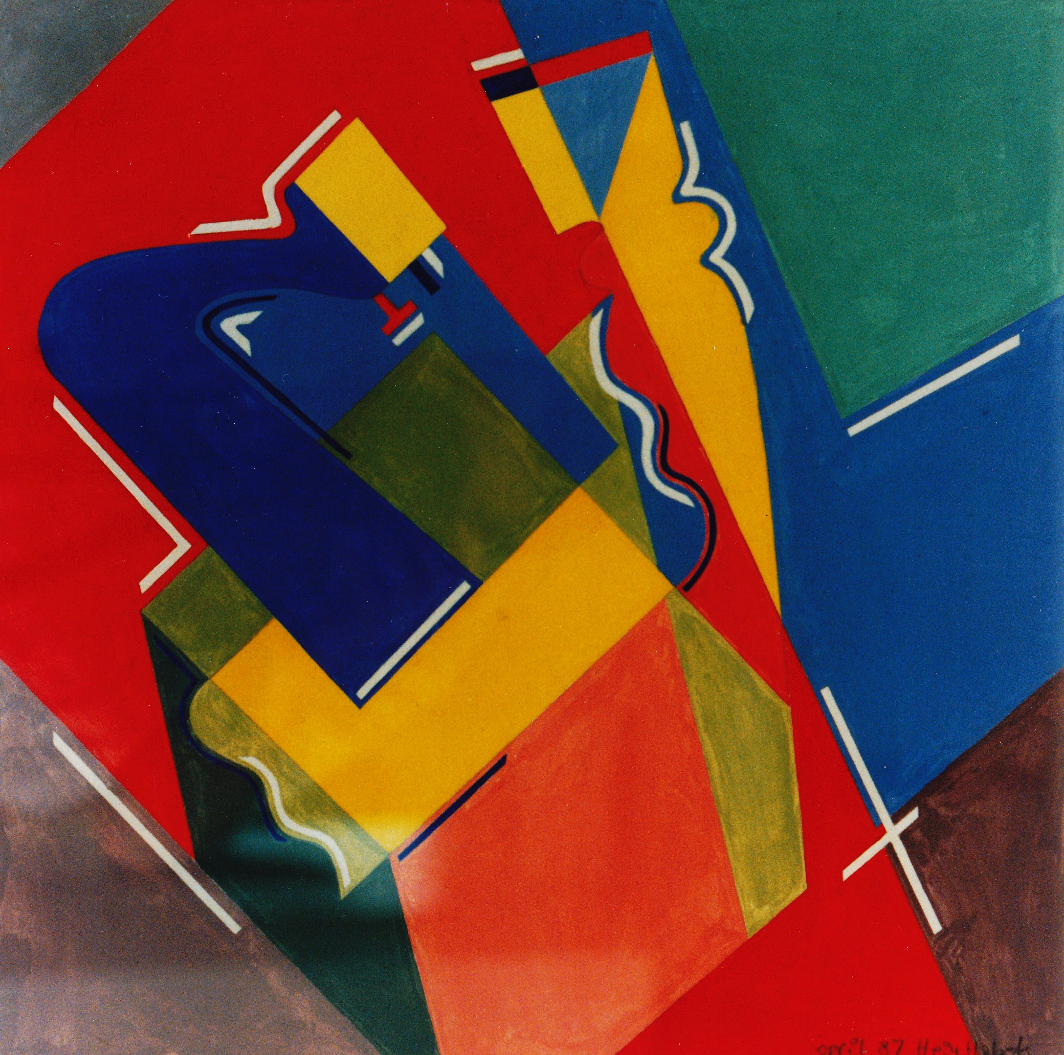 Stil leven als opdracht ABK. Abstractie van stilleven met naaimachine. Invloeden van Mondriaan, Rietveld, Doesburg, etc.