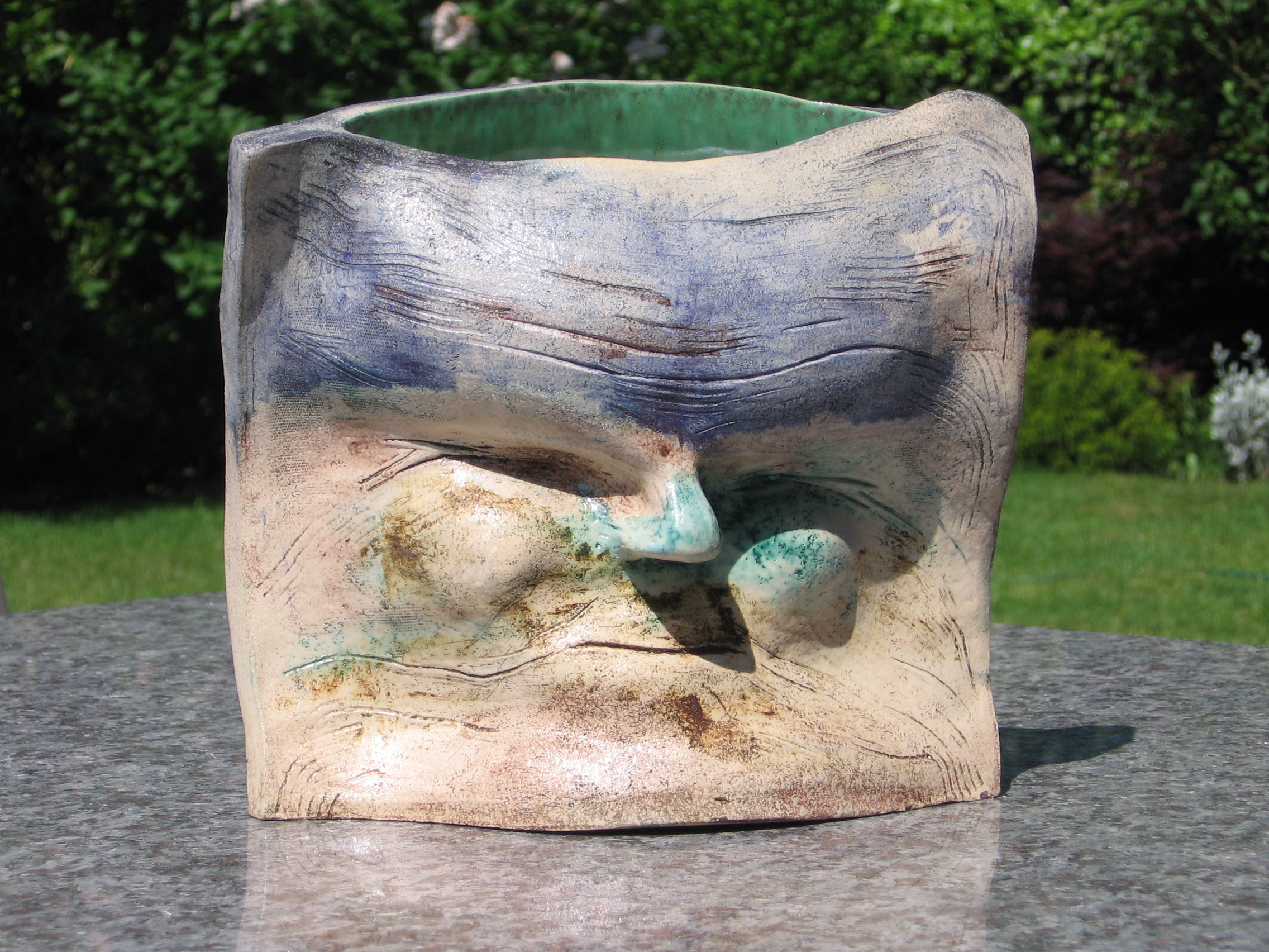 Groene glazuur van binnen en oxide aan de buitenkant.