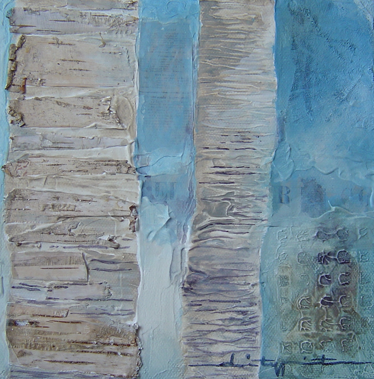 Berkenstammen. Toegevoegd stukjes berkenschors en krantenpapier, met gebruikmaking van de tekst.