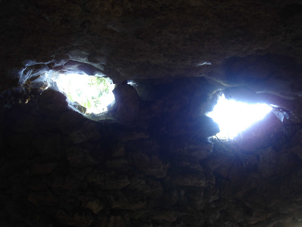 Openingen in de grot met een blauw aureool aan licht dat door de openingen schijnt.