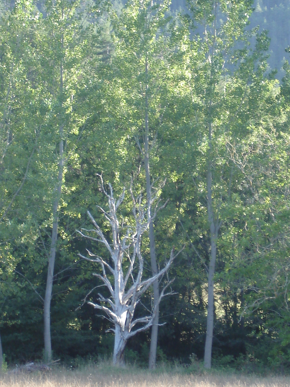 Dode boom wordt in het zonnetje gezet en omgeven door welig groeiende andere bomen.