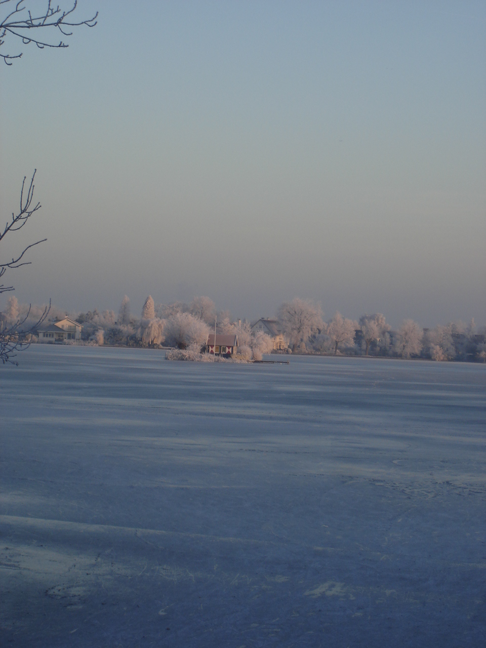 Een huis in een plas, nu bereikbaar via het ijs.