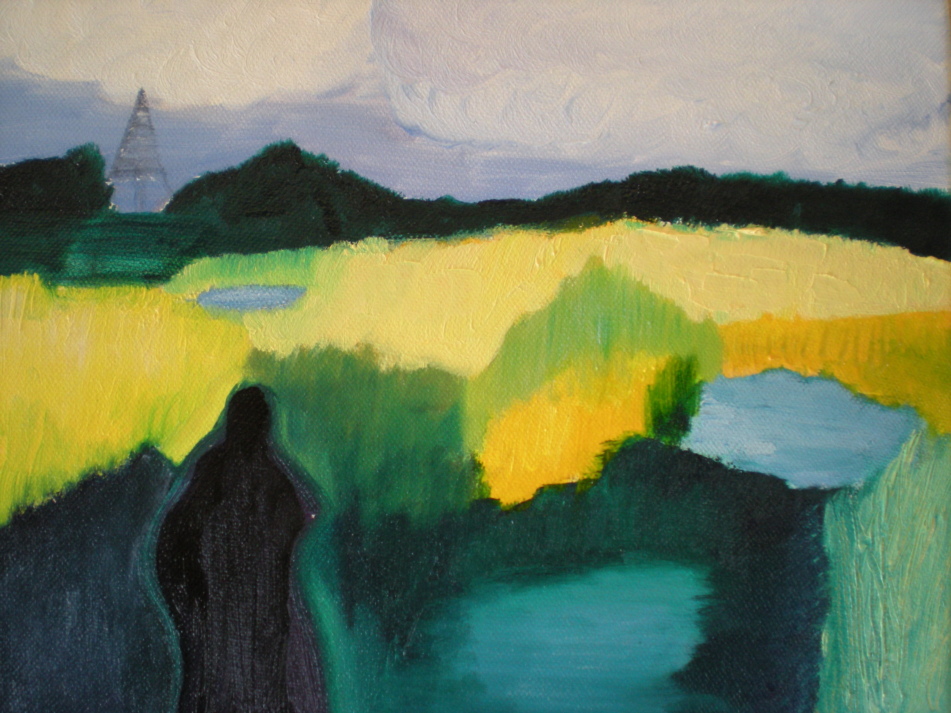 Het baken bij de Kobbeduinen. De schaduw van een man, die een foto neemt. Het landschap is als een lappendeken, de lucht is in beweging.