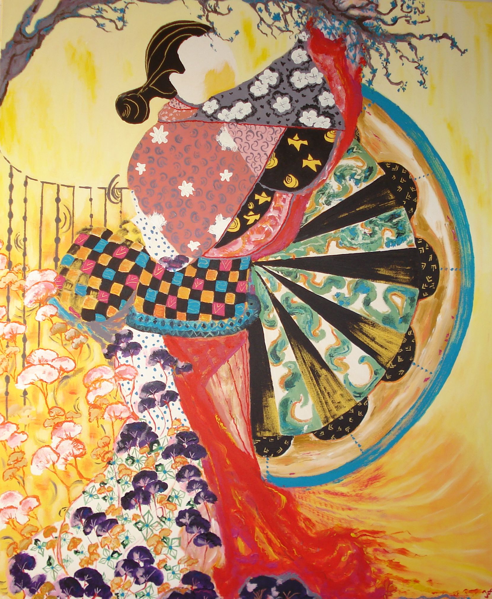Dessintekens op een kimono hebben allemaal een betekenis. Grassen hebben bijvoorbeeld alles te maken met vrouwenzaken. De kersenbloem heeft te maken met lentetijd. Het zijn bijna altijd tekens uit de natuur. In dit werk wil ik tegenovergestelde vormen laten zien, organische- en geometrische vormen door elkaar heen. De benedenvormen zijn van de pijnboom en bol afgeleid. Deze vorm komt vaak in de stof geweven of geborduurd voor. Het betekent een lange en gezonde levenscyclus. Het levenswiel draait naar boven. Ik heb het afwisselend met penseel en paletmes geschilderd. Ook heb ik in sommige gedeelten gekrast met een dun mesje.
