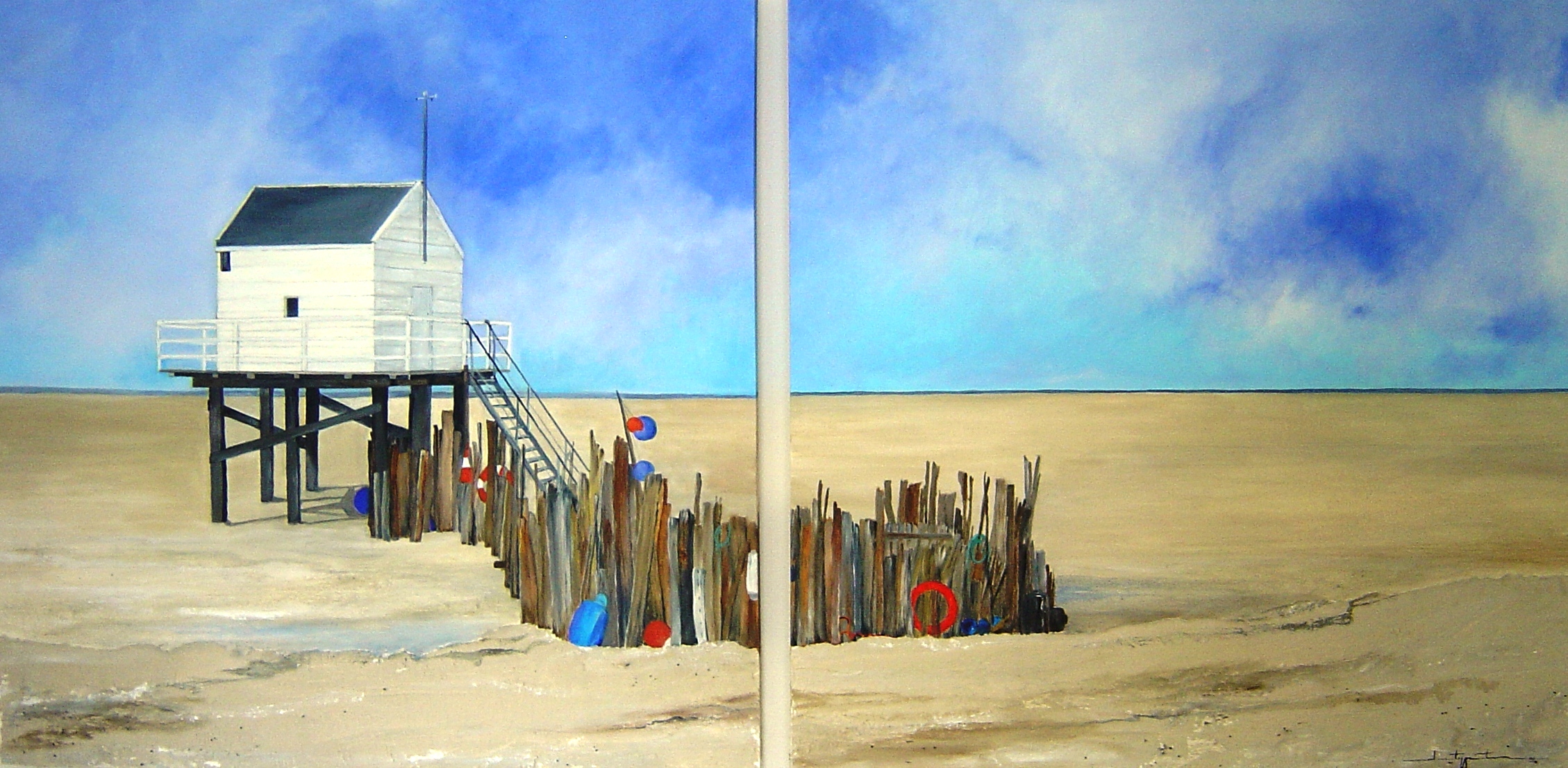 De plaats op Vlieland waar we met veel plezier aan terugdenken. Doorgeschilderd op twee doeken. Zand toegevoegd.
