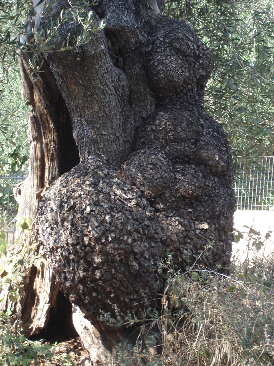 Rusten tegen de stam van een olijfboom.