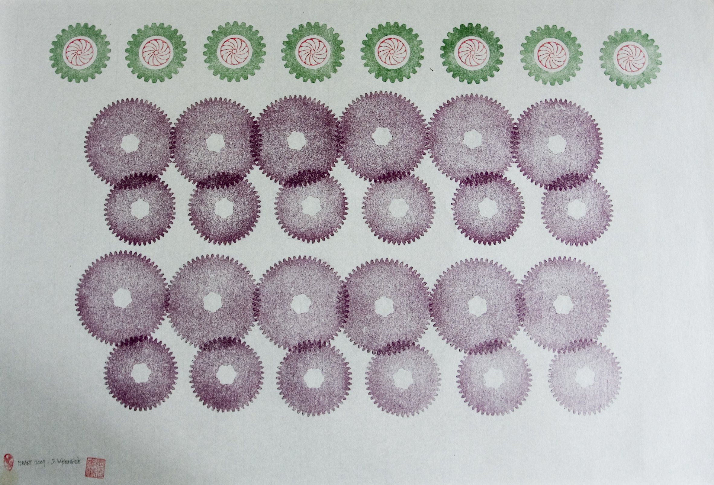 Donald Wijsenbek (1938) is al sinds zijn jeugd gefascineerd door tandraderen. Deze zijn voor hem een inspiratiebron bij het maken van aquarellen en handdrukken, waarbij hij deze vormen als grondpatroon gebruikt.