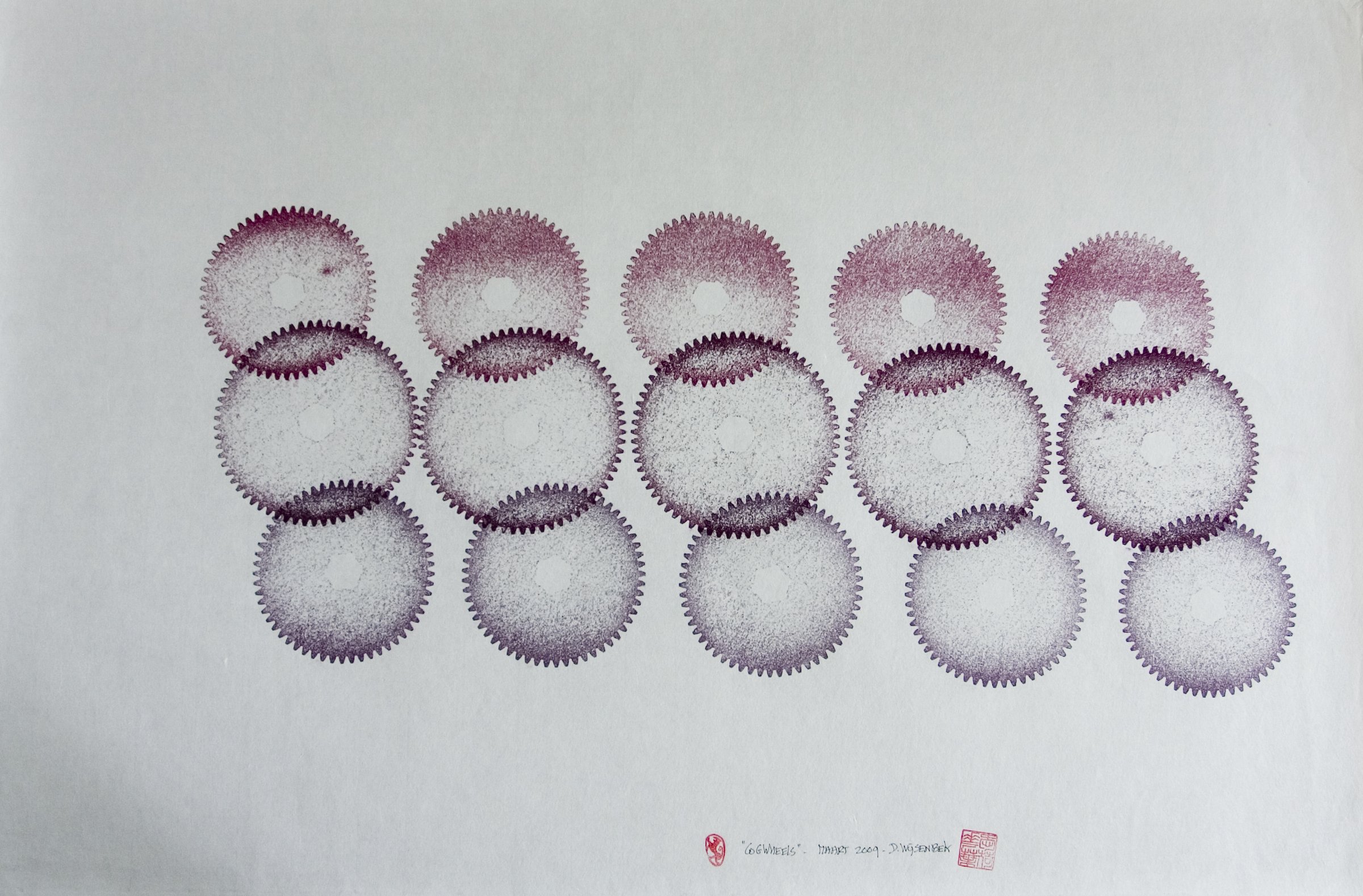 Donald Wijsenbek (1938) is al sinds zijn jeugd gefascineerd door tandraderen. Deze zijn voor hem een inspiratiebron bij het maken van aquarellen en handdrukken, waarbij hij deze vormen als grondpatroon gebruikt.