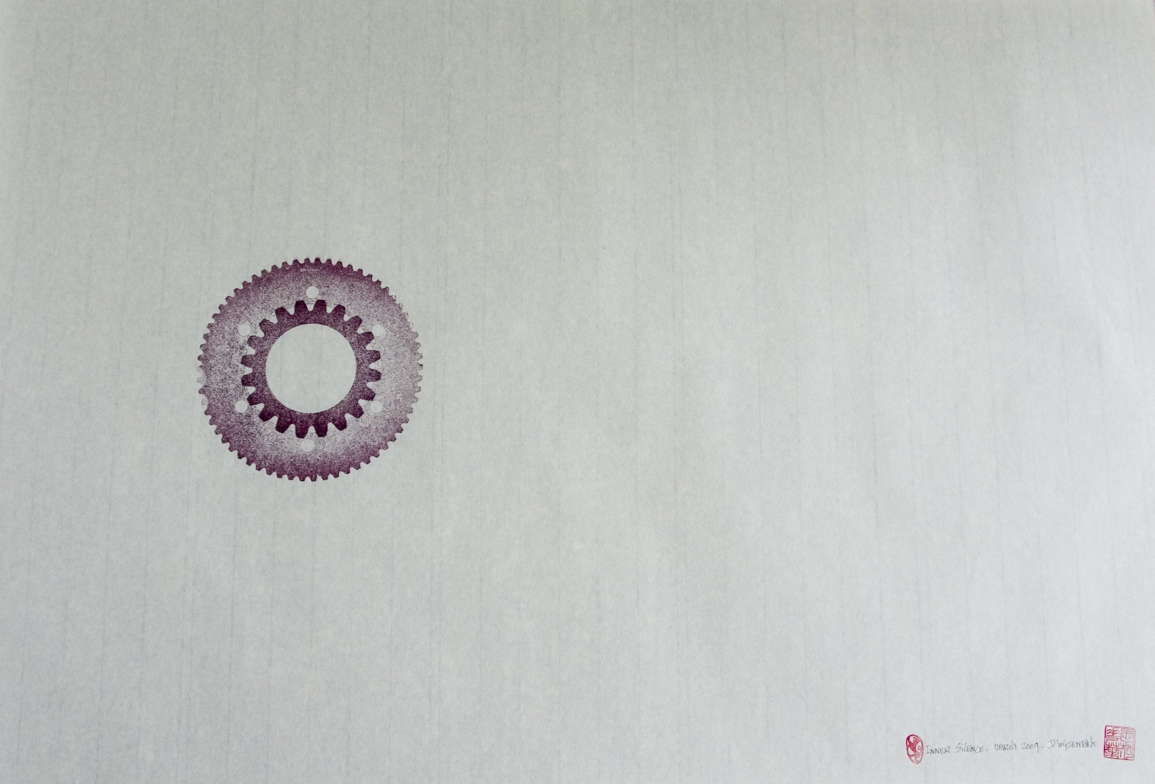 Donald Wijsenbek (1938) is al sinds zijn jeugd gefascineerd door tandraderen. Deze zijn voor hem een inspiratiebron bij het maken van aquarellen en handdrukken, waarbij hij deze vormen als grondpatroon gebruikt.