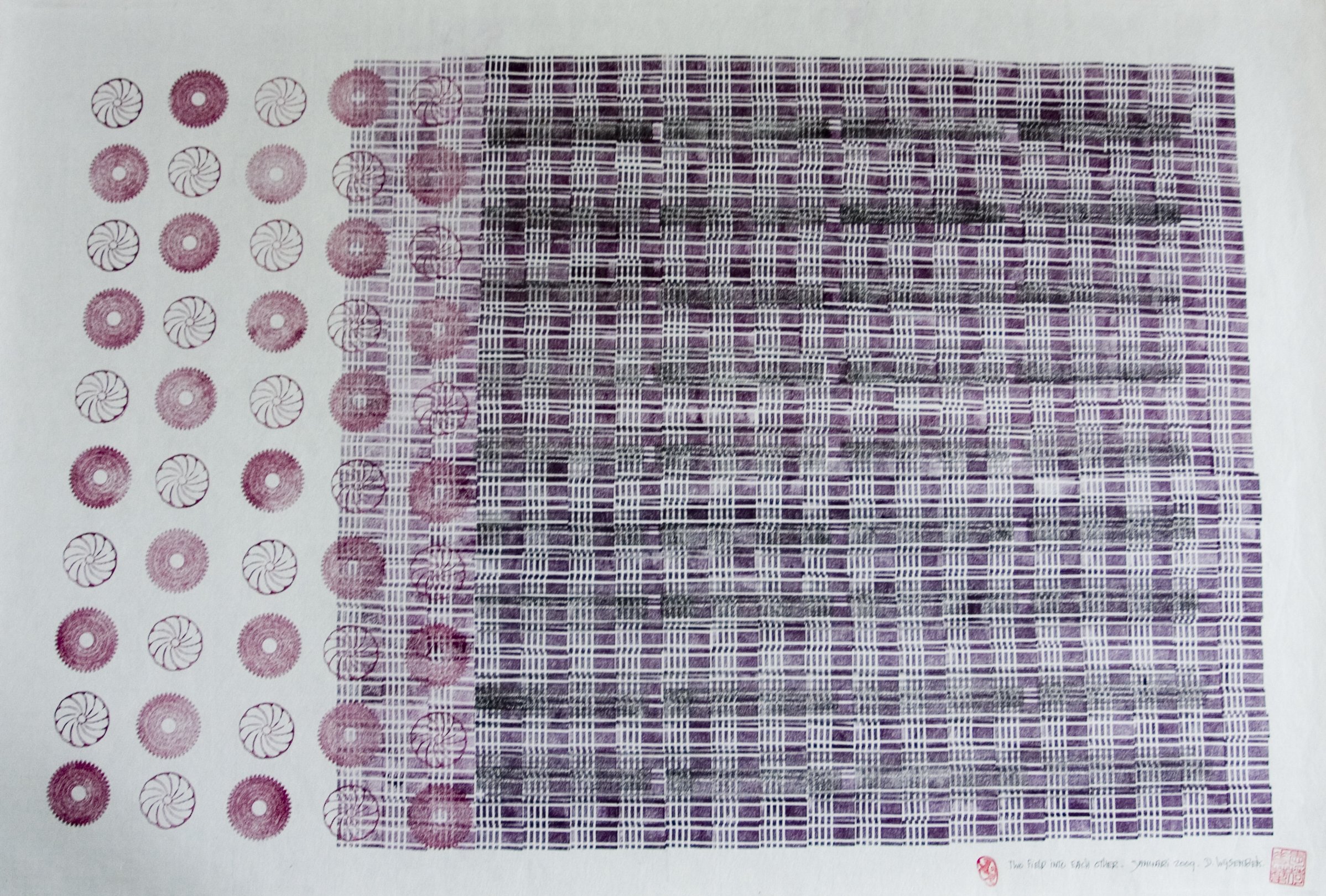 Donald Wijsenbek (1938) is al sinds zijn jeugd gefascineerd door tandraderen. Deze zijn voor hem een inspiratiebron bij het maken van aquarellen en handdrukken, waarbij hij deze vormen als grondpatroon gebruikt.