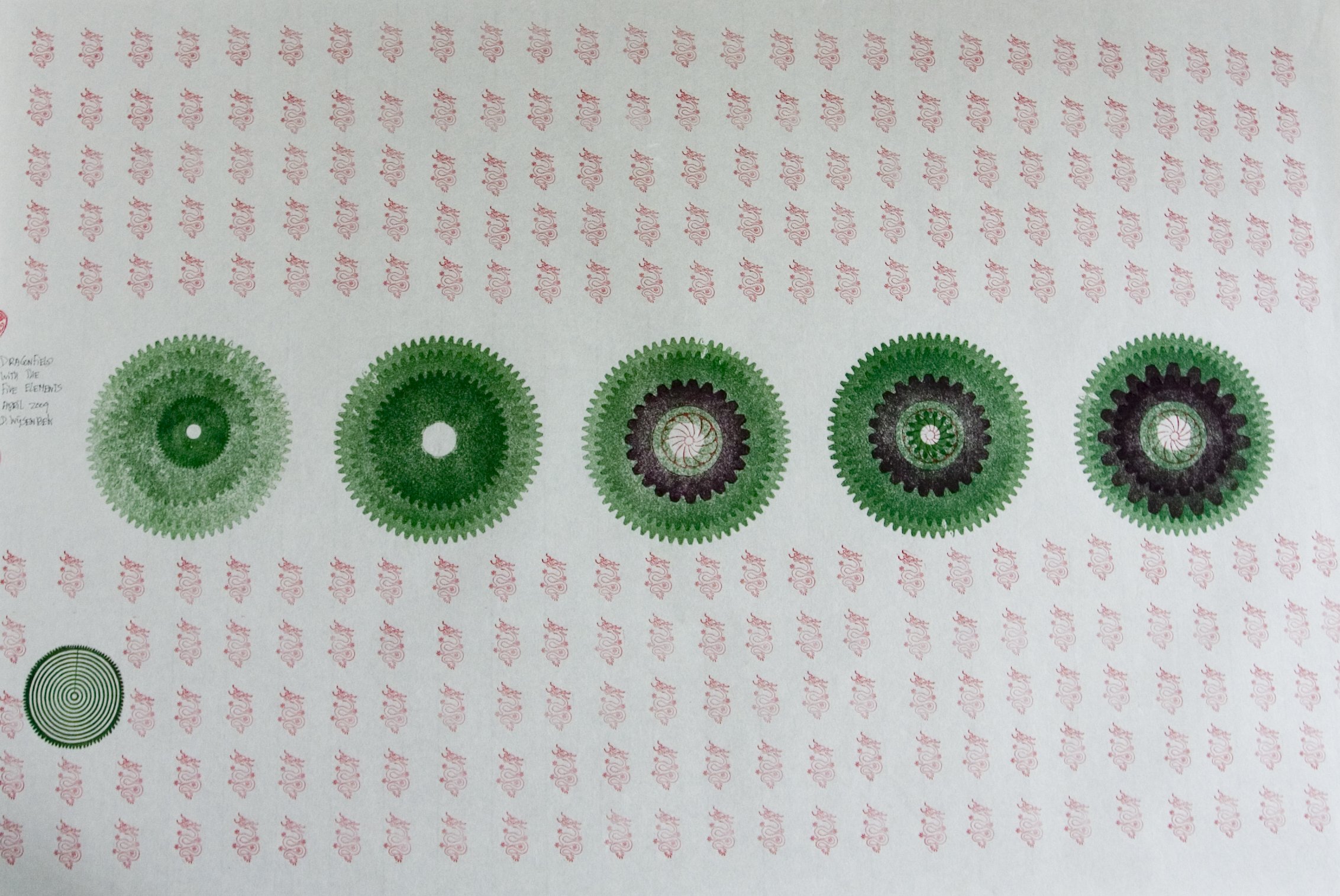 Donald Wijsenbek (1938) is al sinds zijn jeugd gefascineerd door tandraderen. Deze zijn voor hem een inspiratiebron bij het maken van aquarellen en handdrukken, waarbij hij deze vormen als grondpatroon gebruikt.