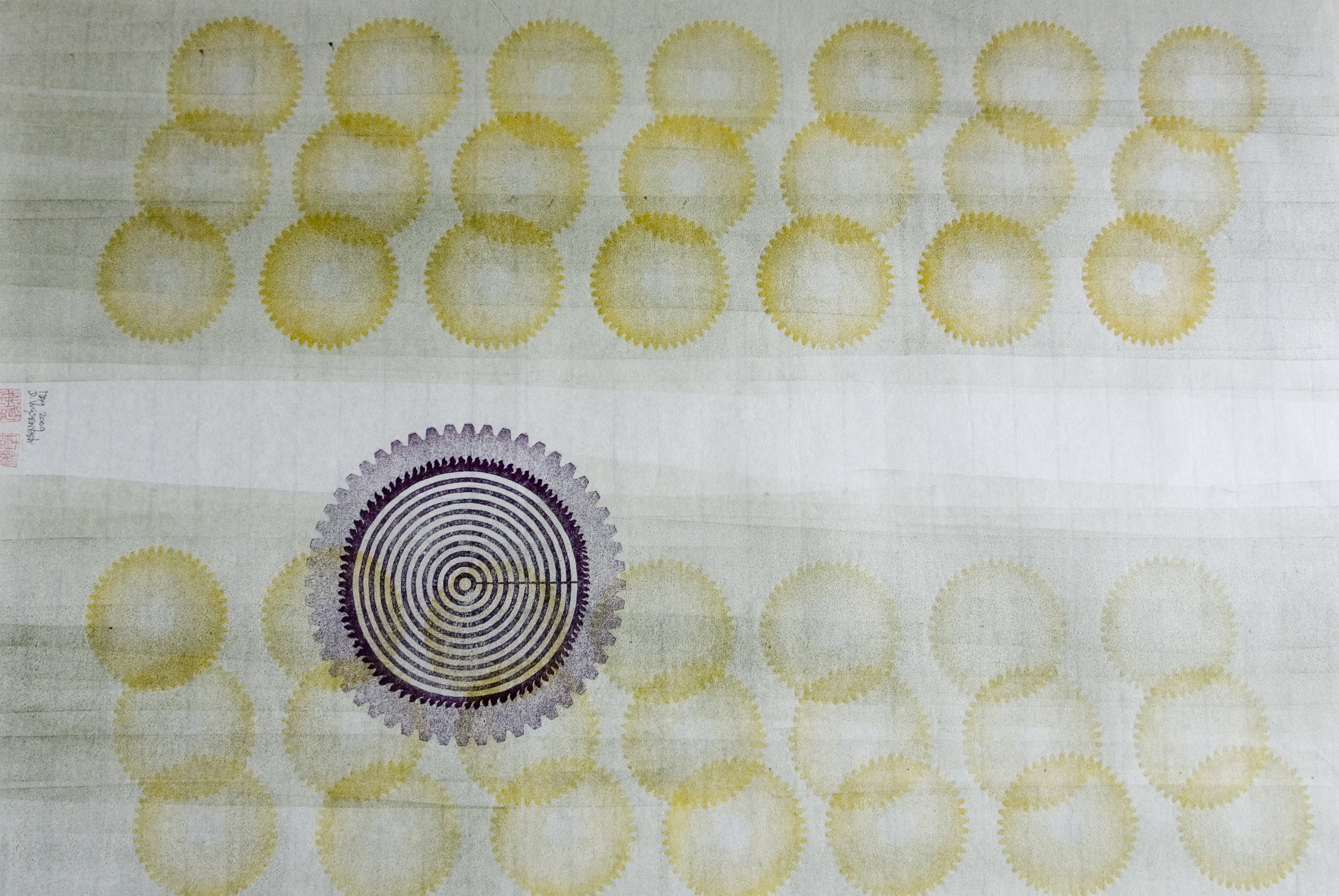Donald Wijsenbek (1938) is al sinds zijn jeugd gefascineerd door tandraderen. Deze zijn voor hem een inspiratiebron bij het maken van aquarellen en handdrukken, waarbij hij deze vormen als grondpatroon gebruikt.