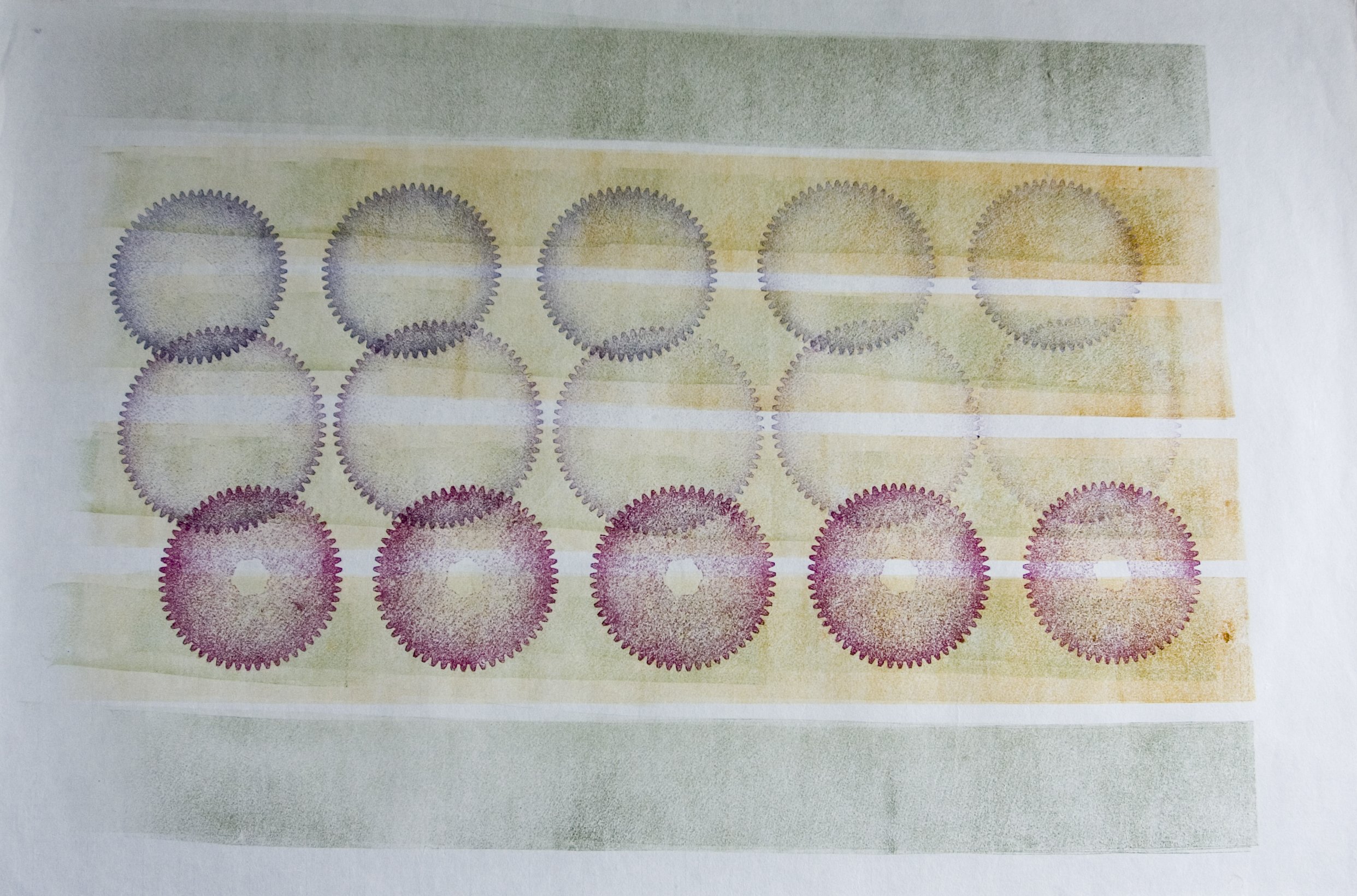 Donald Wijsenbek (1938) is al sinds zijn jeugd gefascineerd door tandraderen. Deze zijn voor hem een inspiratiebron bij het maken van aquarellen en handdrukken, waarbij hij deze vormen als grondpatroon gebruikt.