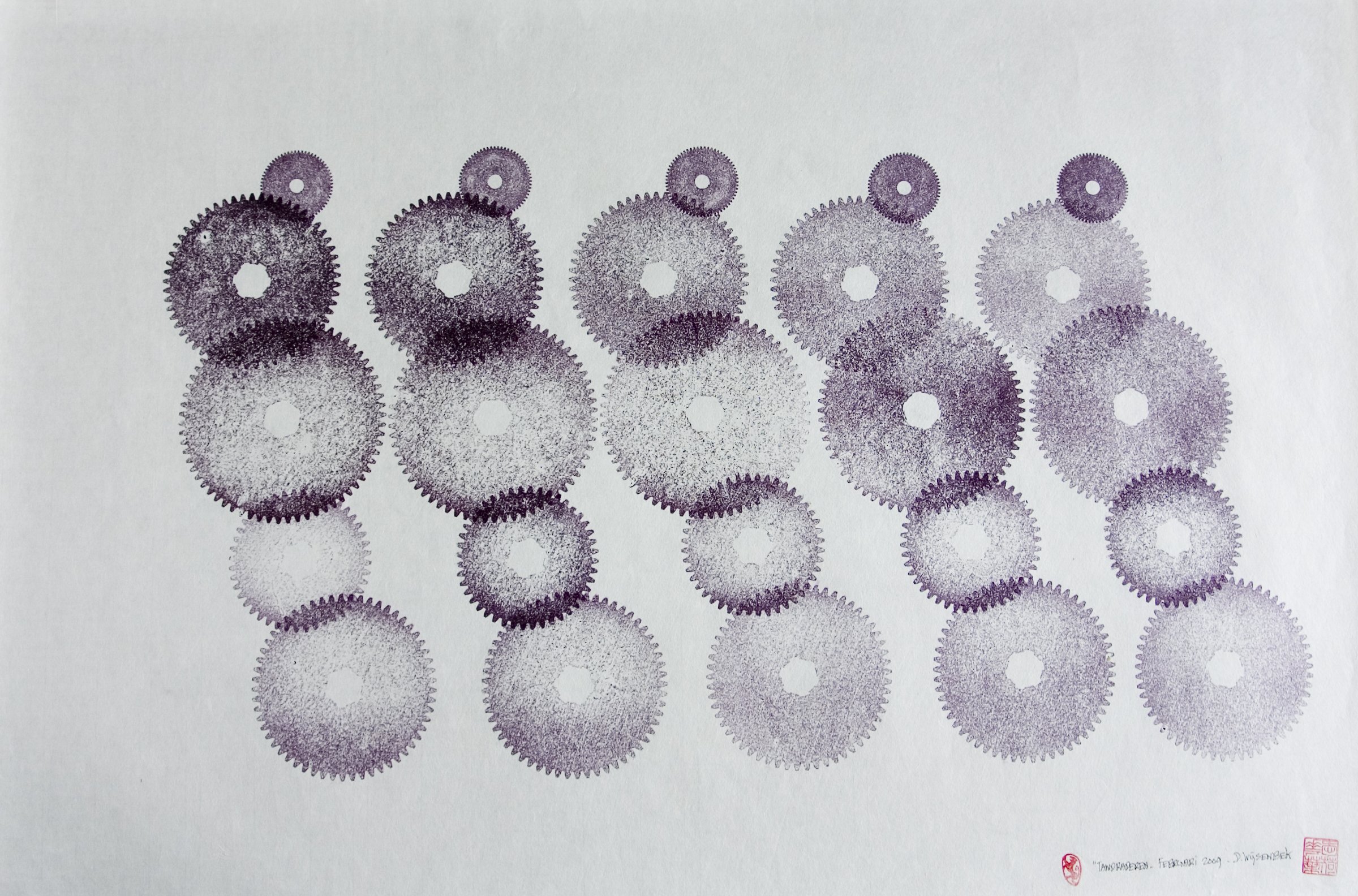 Donald Wijsenbek (1938) is al sinds zijn jeugd gefascineerd door tandraderen. Deze zijn voor hem een inspiratiebron bij het maken van aquarellen en handdrukken, waarbij hij deze vormen als grondpatroon gebruikt.