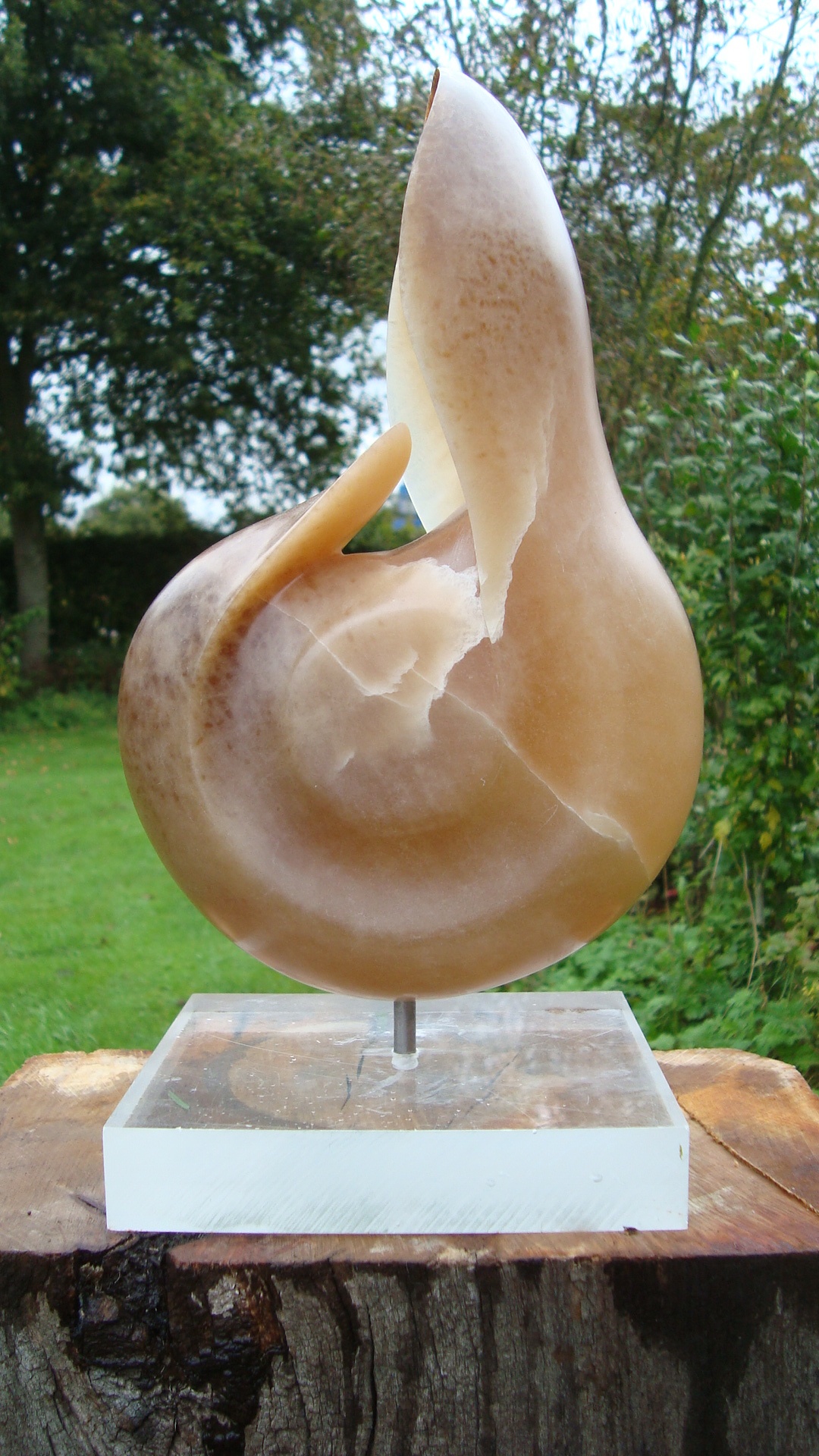 Een transparante caramelalbast, waarin de spiralende vorm symbool staat voor de oneindigheid, en het schelpachtige uiterlijk voor het voortbrengende leven. De sokkel is van perspex.