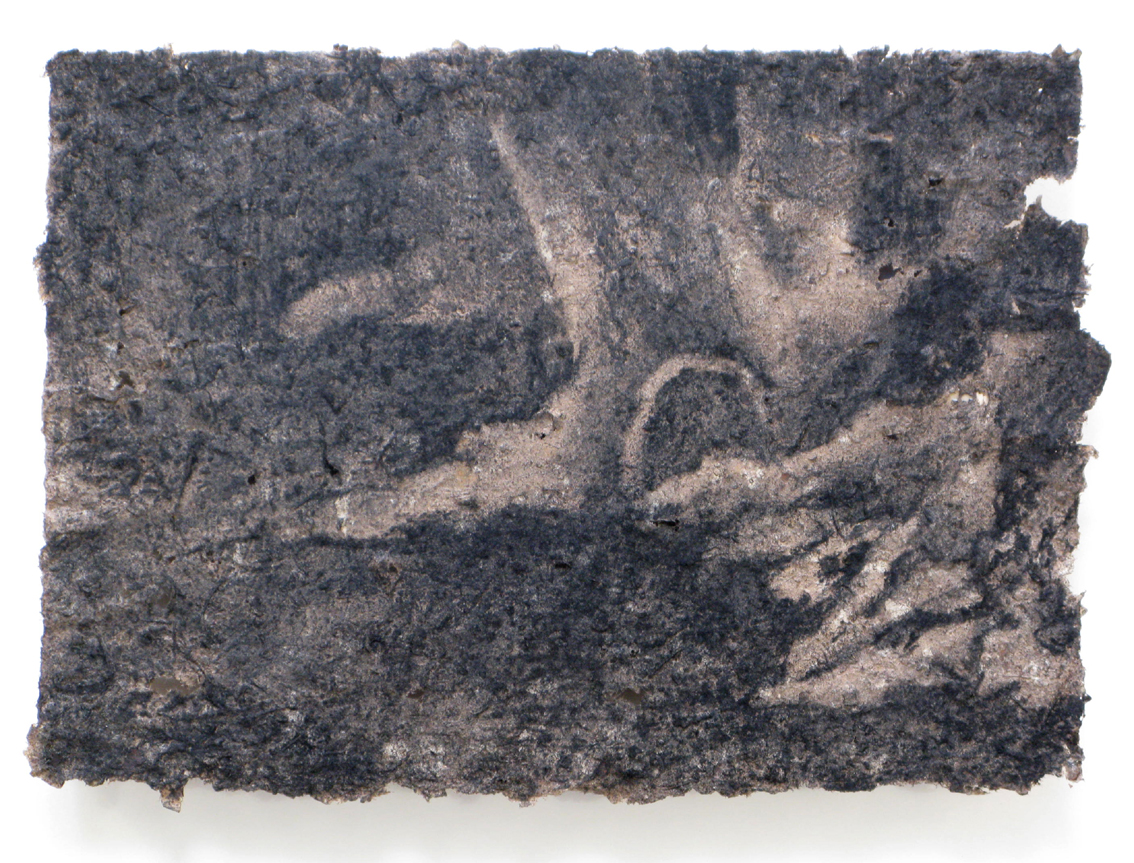 Houtskool op handgeschept papier, waarin houtsnippers en bladeren zijn verwerkt