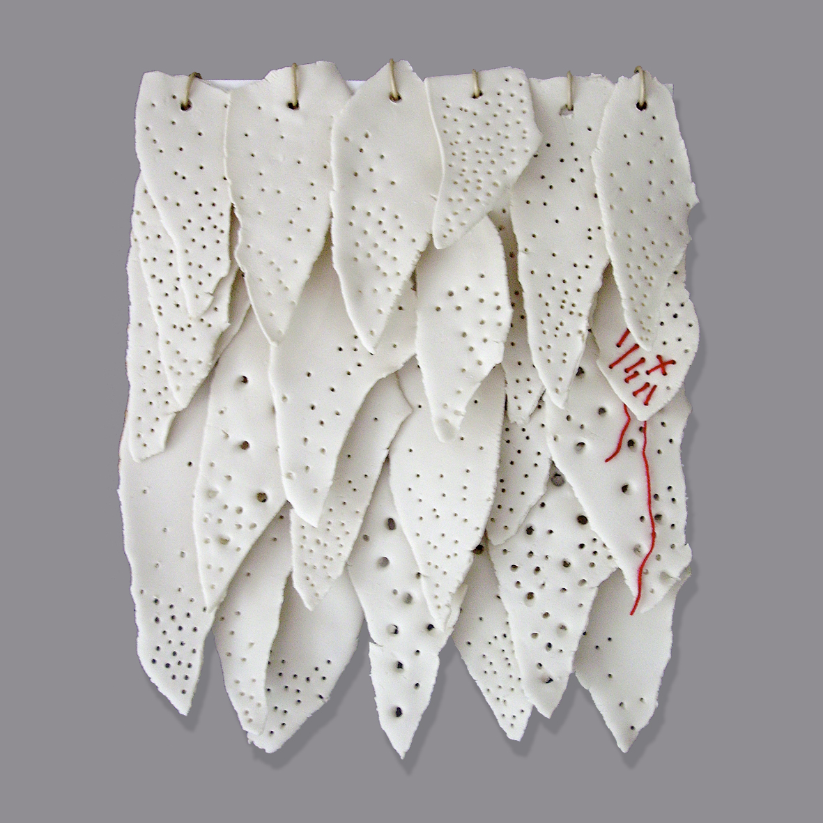 Wandobject bestaande uit porseleinen elementen met geborduurde toevoeging.