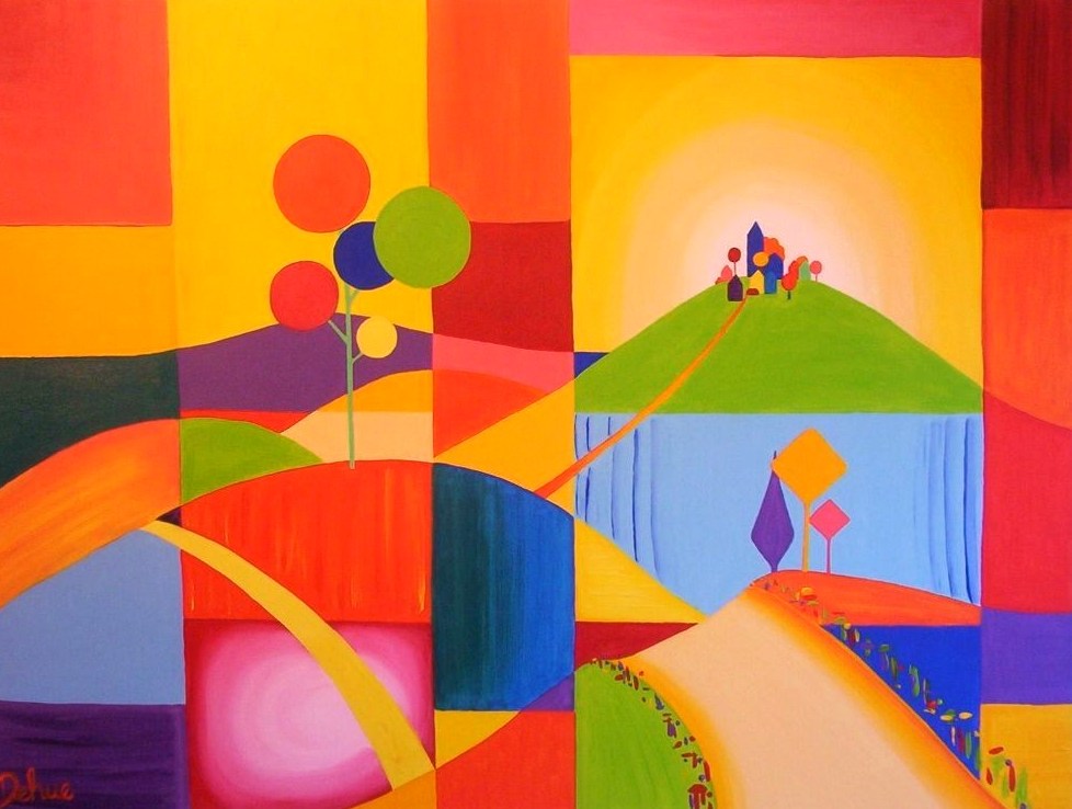 Schilderij Rood Oranje Geel Landschap Blauw Acryl Paars Groen Kleurrijk Bomen Roze Vrolijk Landscape Fantasie Kleur Huizen Huisjes Colorful Pad Kleurvlakken Opvallend Fantasylandscape Colorblocks Mozaïeklandschap