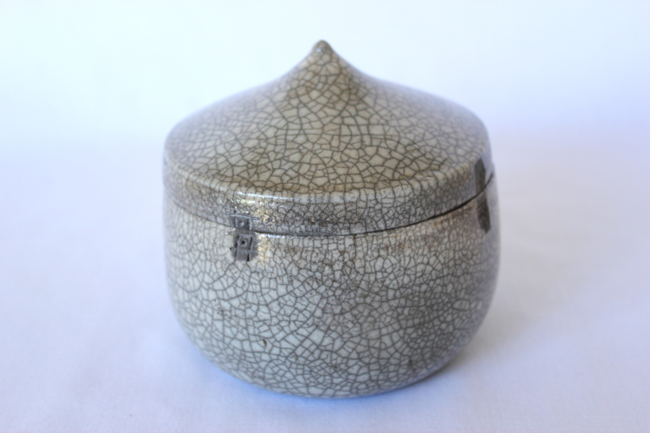 raku doos met deksel, wit craquele glazuur, aardewerk.