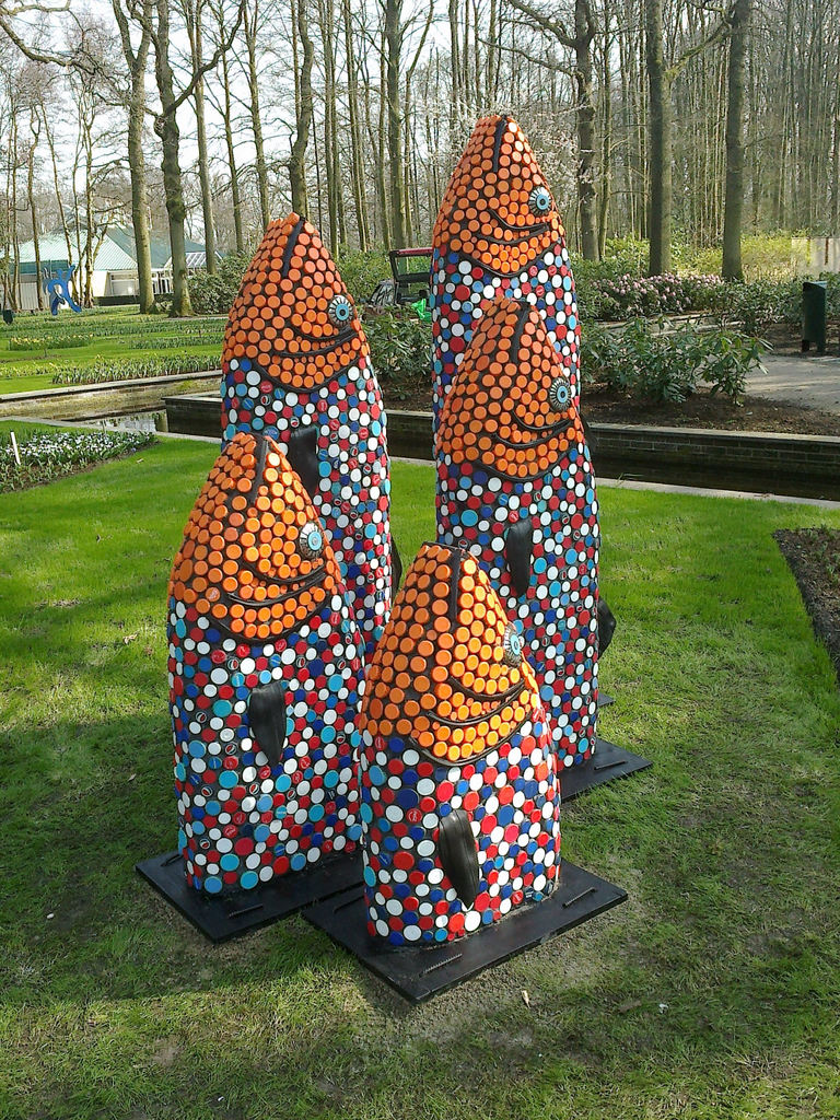 basis is isolatiemateriaal voorzien van een stalen frame. Het geheel is belegd met plastic dopjes van frisdrankflesjes in de kleuren oranje, rood, wit en blauw
