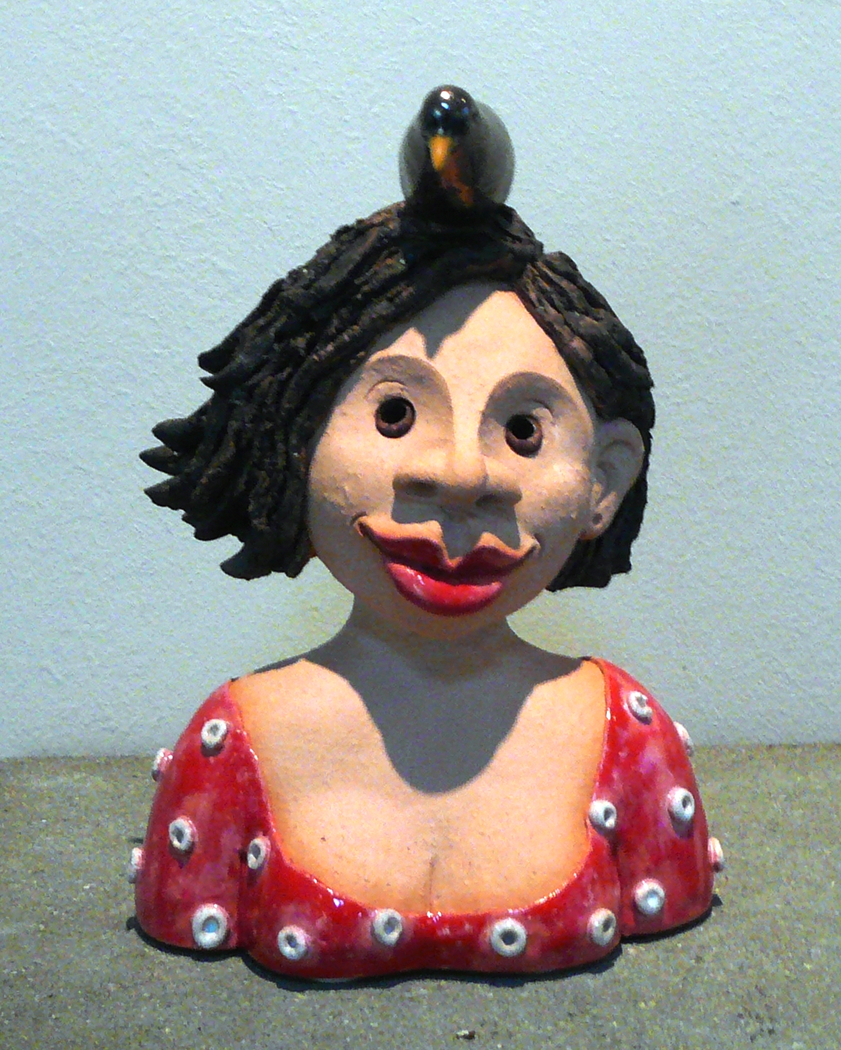 Klein terra cotta vrouwenkopje in rood truitje met witte bolletjes erop.