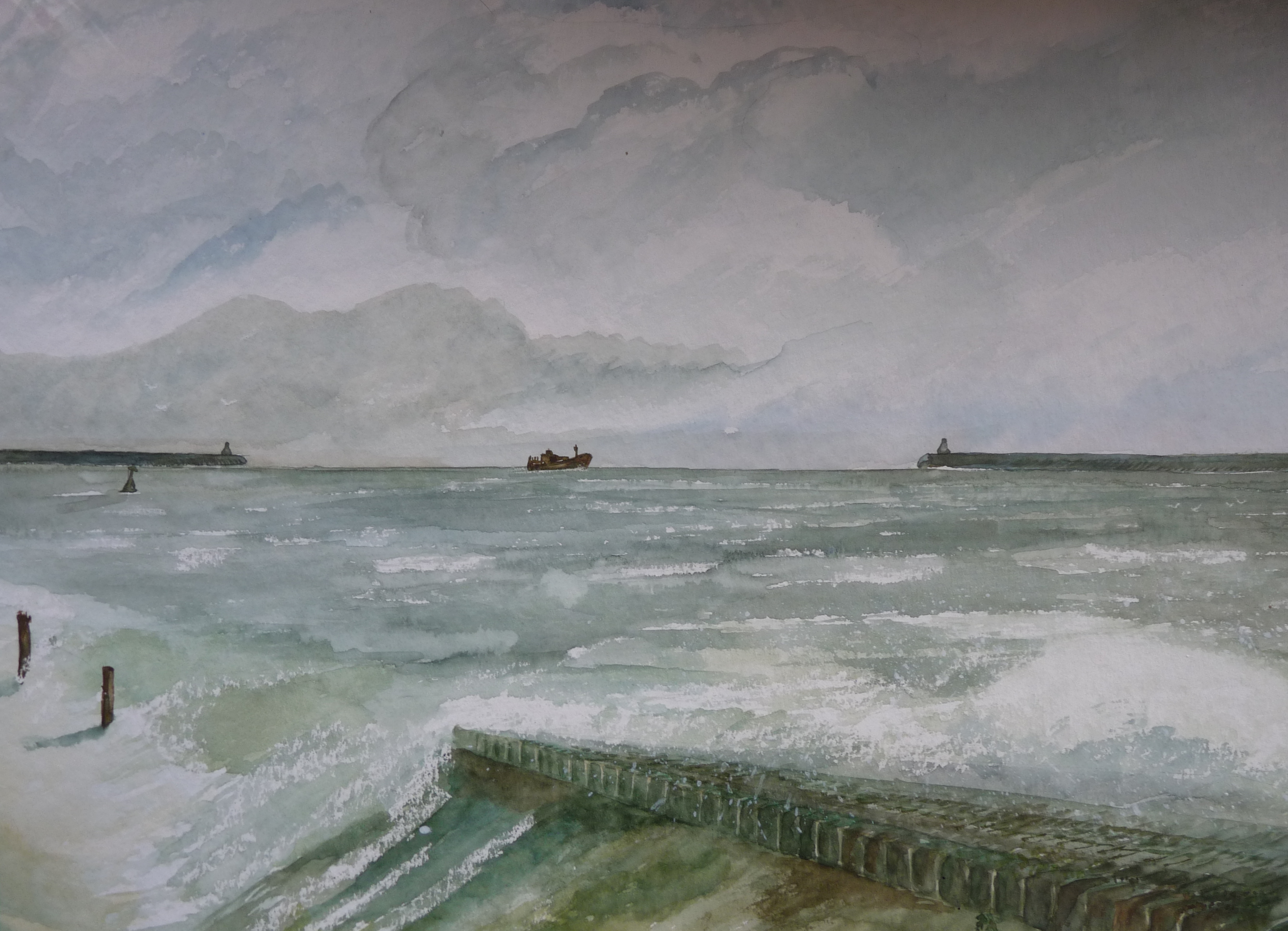 Een schip vaart vanaf een onstuimige zee richting de beschutte haven ergens aan de Nederlandse kust.