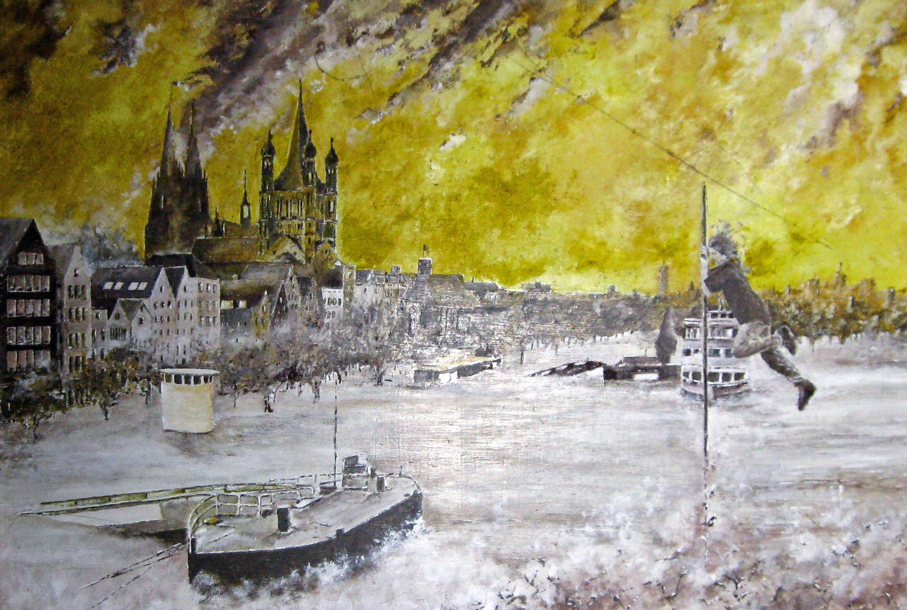 Keulen Rijn Rivier Dom Huizen Meisje Stok Springen Overstroming Lucht Winter