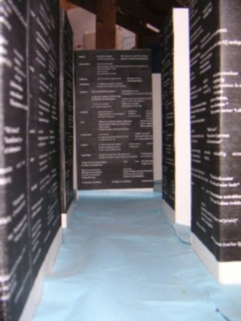 Naar aanleiding van een expositie, realiseerde ik mij dat mensen mijn werk vaak anders interpreteren. Hierdoor ben ik gaan nadenken over taal. Ik heb gekozen voor spreekwoorden, spreuken en zienswijze uit dialecten en nederlandse taal. Hiermee wil ik laten zien dat taal heel verwarrend kan zijn. Het is een doolhof van uitdrukkingen, die zo verschillend kan worden uitgelegd, dat je spraakverwarring krijgt. Ook wil ik laten zien dat taal mooi is. Installatie Ik heb een doolhof gemaakt, waar de wanden beschreven zijn met teksten.