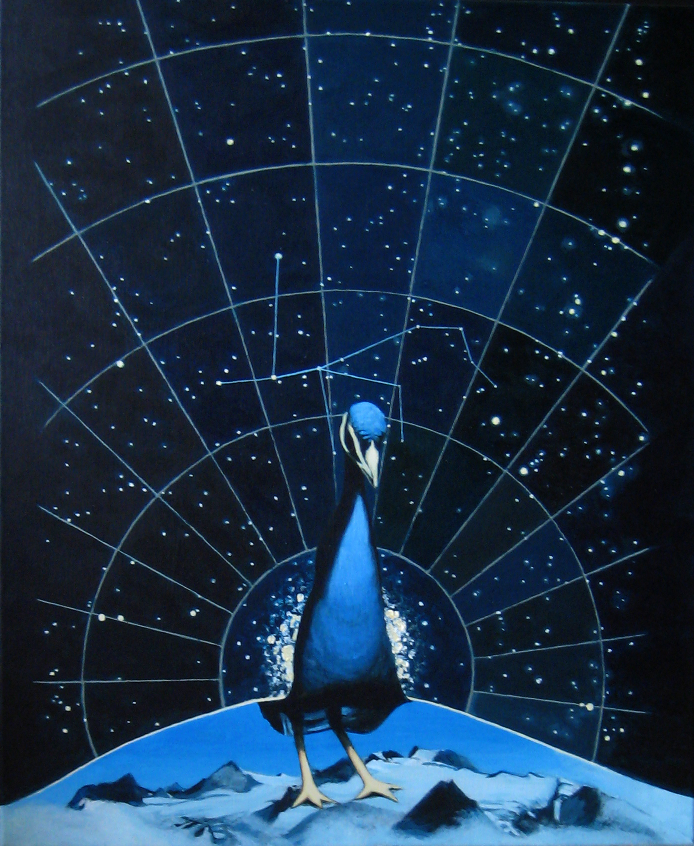 Een pauw die de ogen van de nacht draagt. Hera gaf aan haar lievelings dier, de pauw, de ogen van de omgebrachte 100-ogige reus Argus Panoptes. De sterren komen overeen met het sterrenbeeld PAVO (zichtbaar vanaf het zuidelijk halfrond).