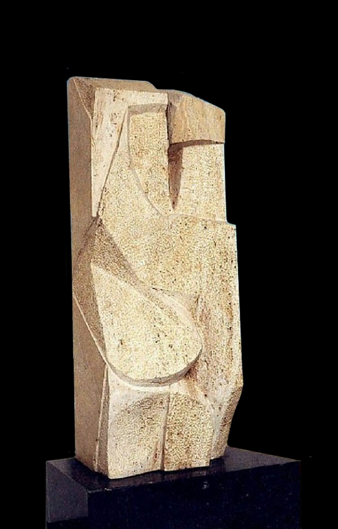 Twee geabstraheerde figuren, uitgevoerd in Sienna travertino. Dit beeld toont een nauwe verbondenheid tussen een man en vrouw, waarin op subtiele wijze de aandacht gevestigd wordt op de nog heersende maatschappelijke hiërarchische verhoudingen.