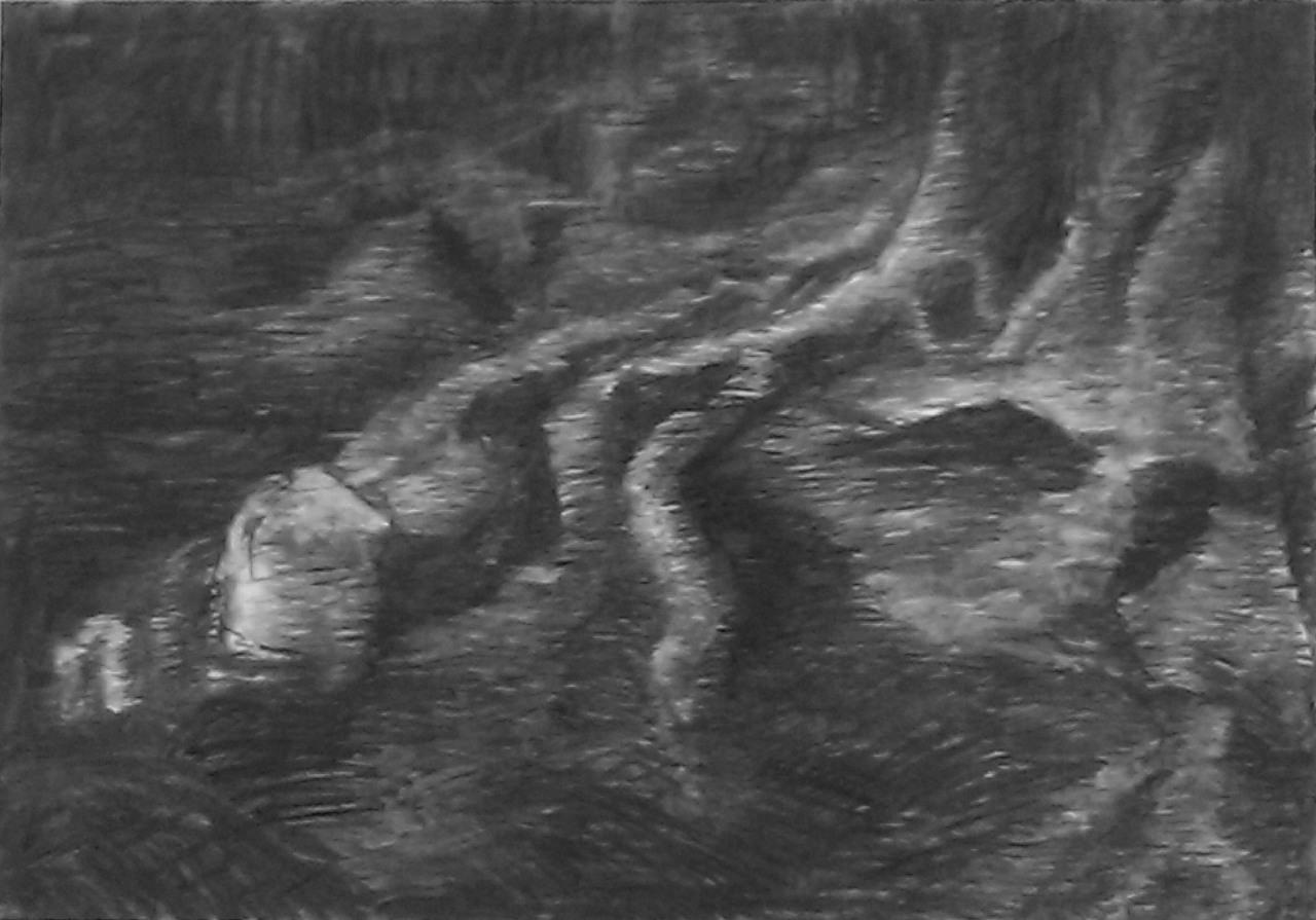 Tekeningen met houtskool, het verbrande materiaal van de bomen, met als onderwerp de verdronken bossen in nederland
