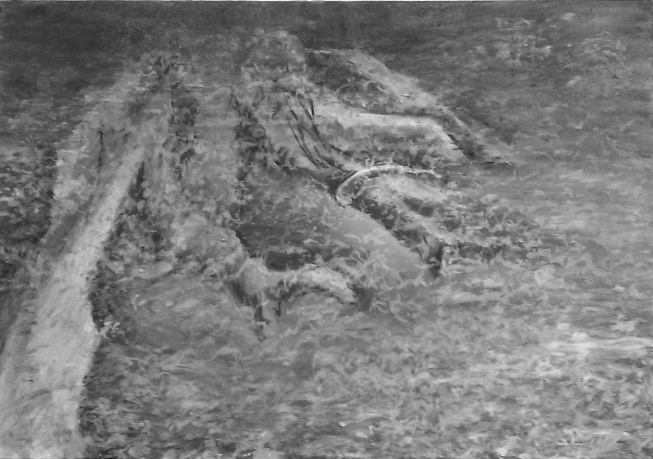 Tekeningen met houtskool, het verbrande materiaal van de bomen, met als onderwerp de verdronken bossen in nederland