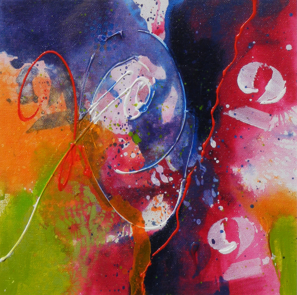 kleurrijke expressie op doek in passe partout van 50 x 50 in zilverkleurige lijst