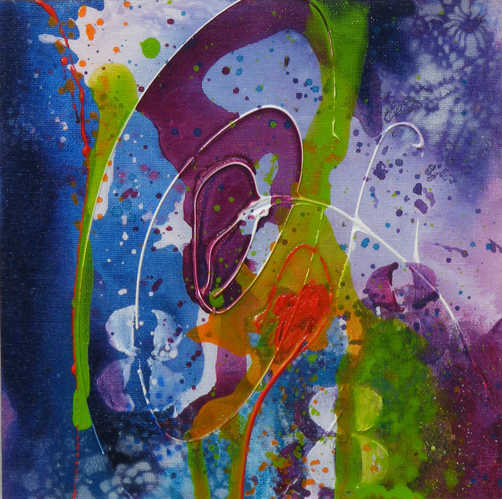 kleurrijke expressie in passe partout van 50 x 50 in zilverkleurige lijst