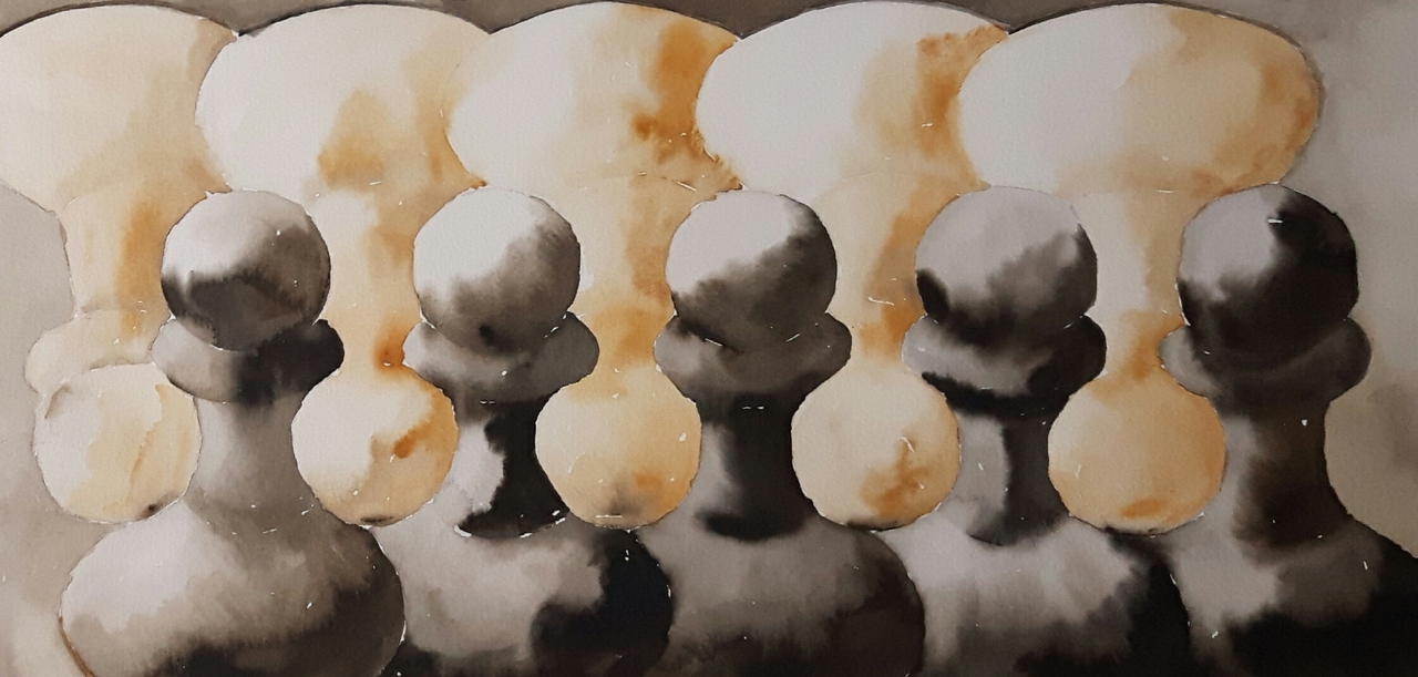 Door het kleurenspel vormen de witte en zwarte pionnen een abstracte compositie.