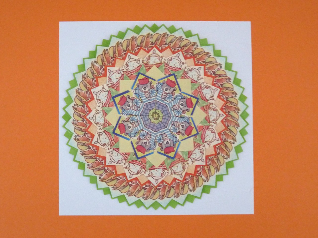 Deze mandala heeft een doorsnede van 15 cm en is van buiten naar binnen gemaakt, want anders komen de afbeeldingen niet tot zijn recht. Mijn kleindochters vinden ze prachtig.