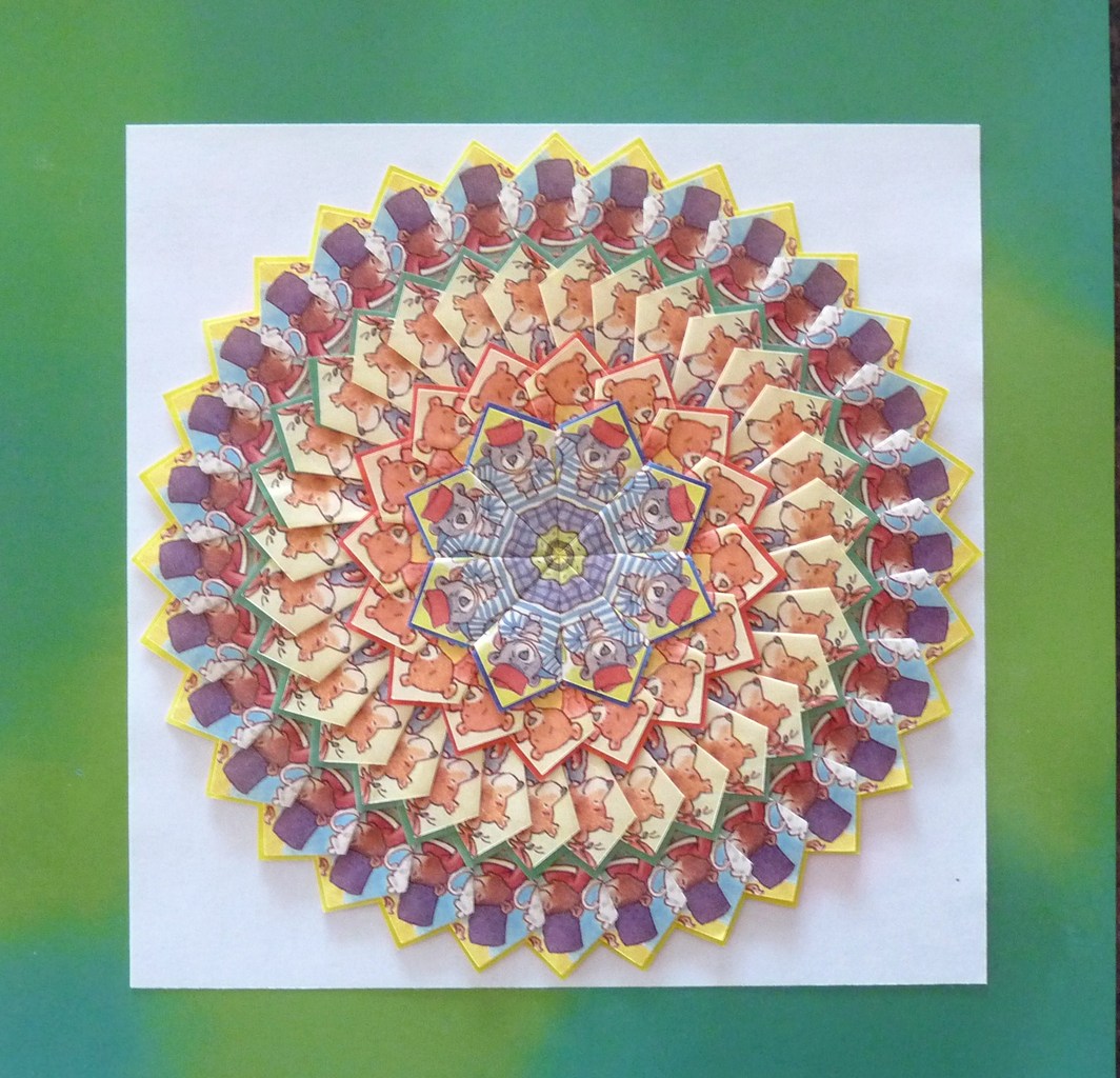 Allemaal berenkoppies, die verschillende kanten opkijken. Erg leuk. De mandala is van buiten naar binnen gewerkt, omdat de afbeeldingen dan goed tot hun recht komen.