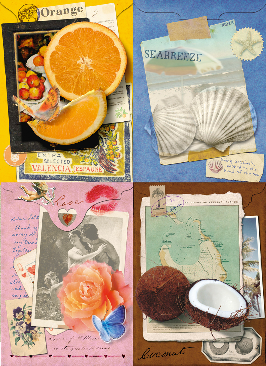 Dit zijn vier digitale collages uit de derde serie geursachets van Jacob Hooy.