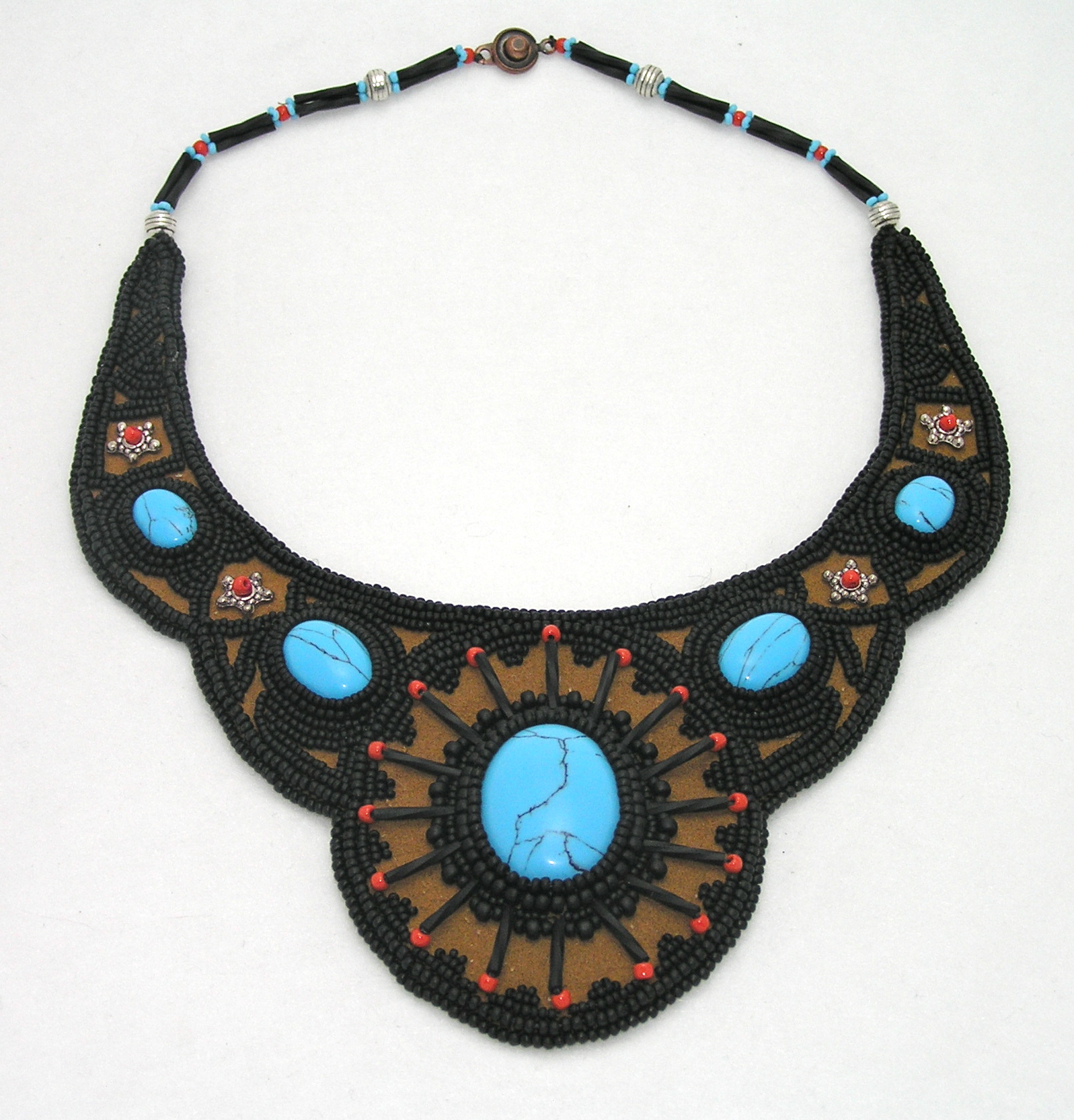 Korte halssieraad met gereconstrueerde turkooise cabochons. Achterzijde is bekleed met zachte stof.