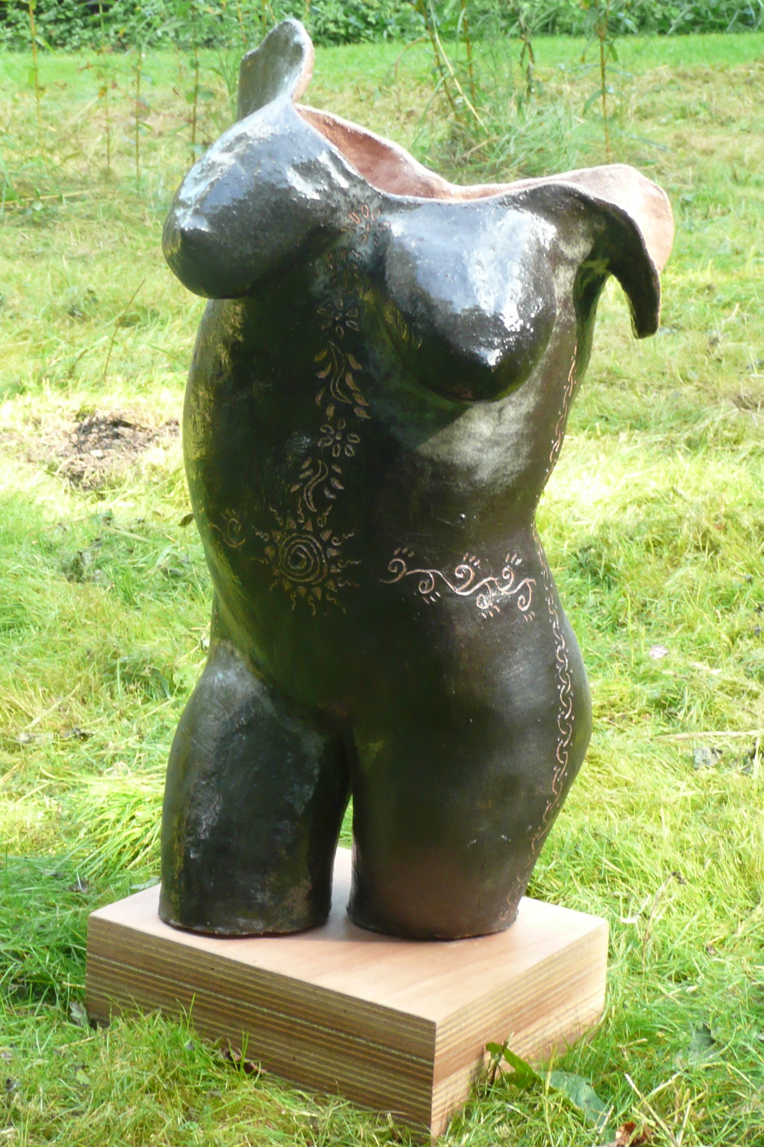 Ik maak torso's, ik versier de huid met tattoo's, kijk onder de huid naar spieren, en wat er over die huid gedragen kan worden. Iedere verandering, roept direkt een indruk op, over de persoon achter de torso. Diverse materialen, keramiek, metaal.