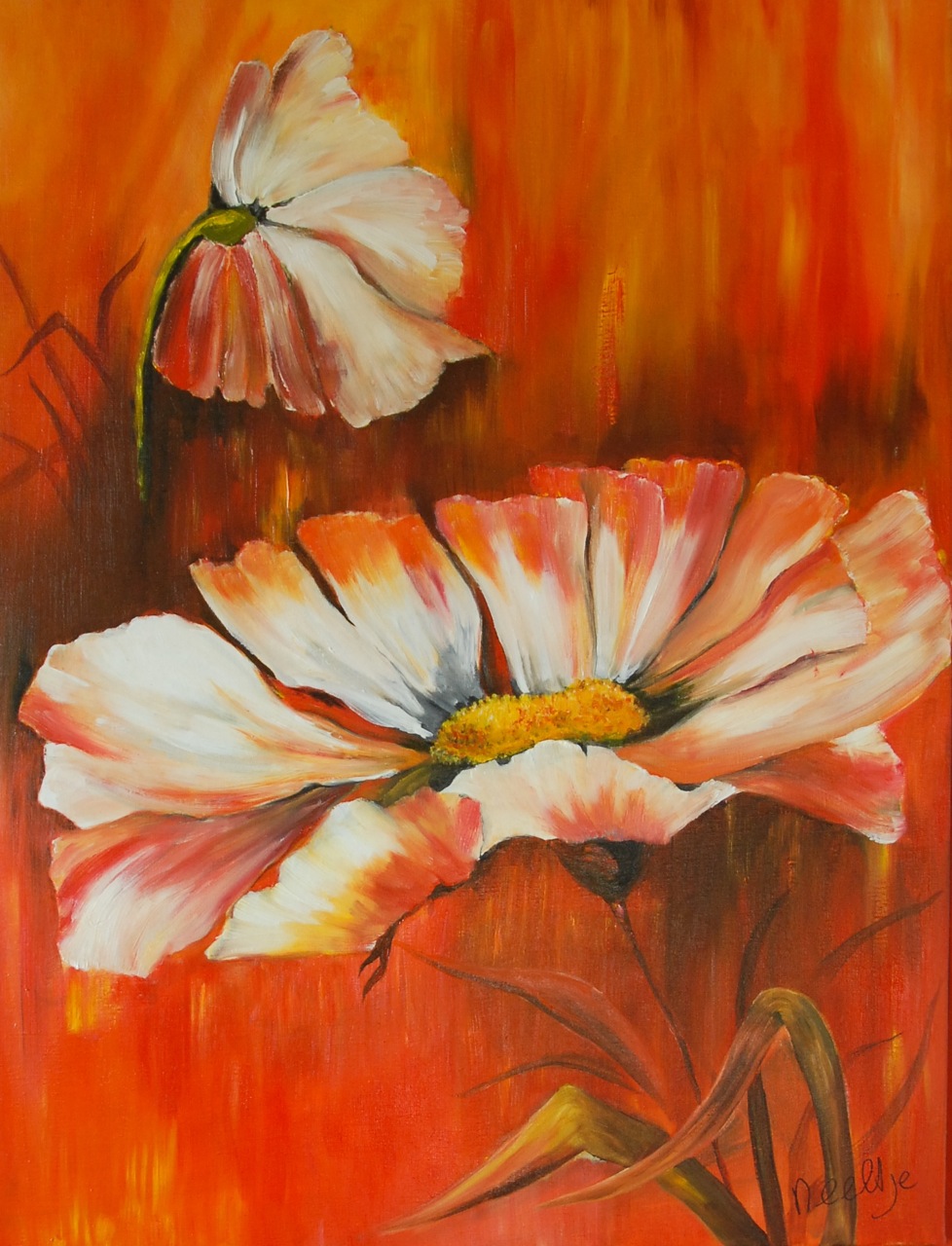 Zo nu en dan moet je ook eens iets durven uit te proberen en niet standaard de bloem schilderen in zijn natuurlijke omgeving. De kleur maakt, dat het schilderij, dat eveneens omlijst is in dezelfde felle kleuren en opvallend element wordt in de huiskamer.