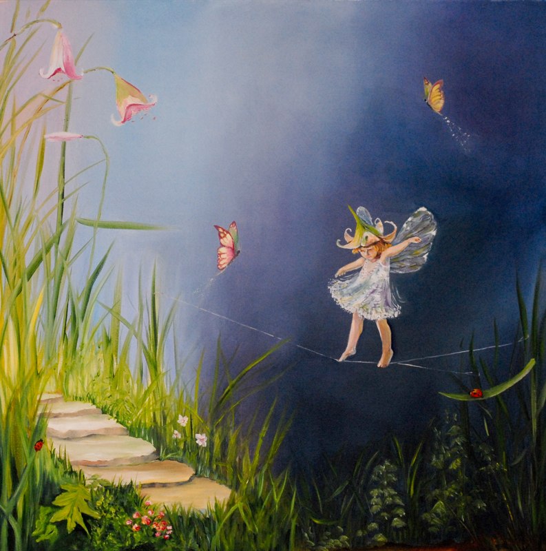 Het mystieke van sprookjes heeft mij altijd bekoord. Onze kleinkinderen vinden elfjes en kabouters prachtig en soms vinden ze dat terug in verschillende schilderijen van mij. Hier balanceert een elfje op een draadje spinrag.